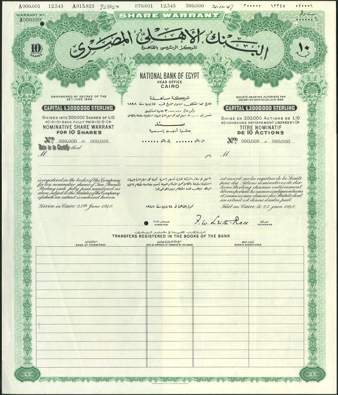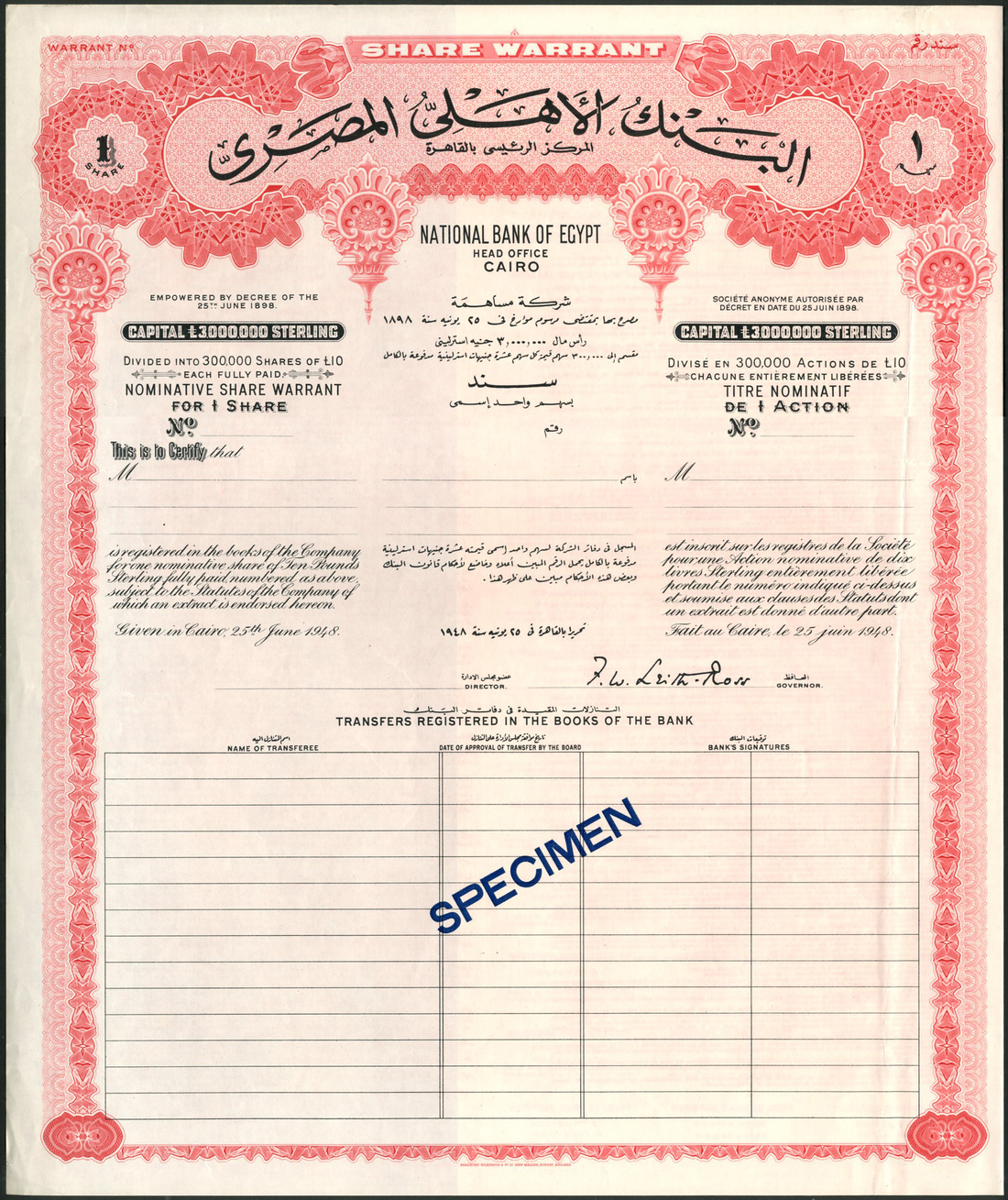 National Bank of Egypt, a pair of specimen certificates for 1 and 10 shares of £10, Cairo 1948, from the Bradbury, Wilkinson & Co. archives, large format with ornate borders, red and green respectively, text in English, Arabic and French, with coupons, the first overprinted SPECIMEN in blue, the second with printers annotations at top, extremely fine. (2)