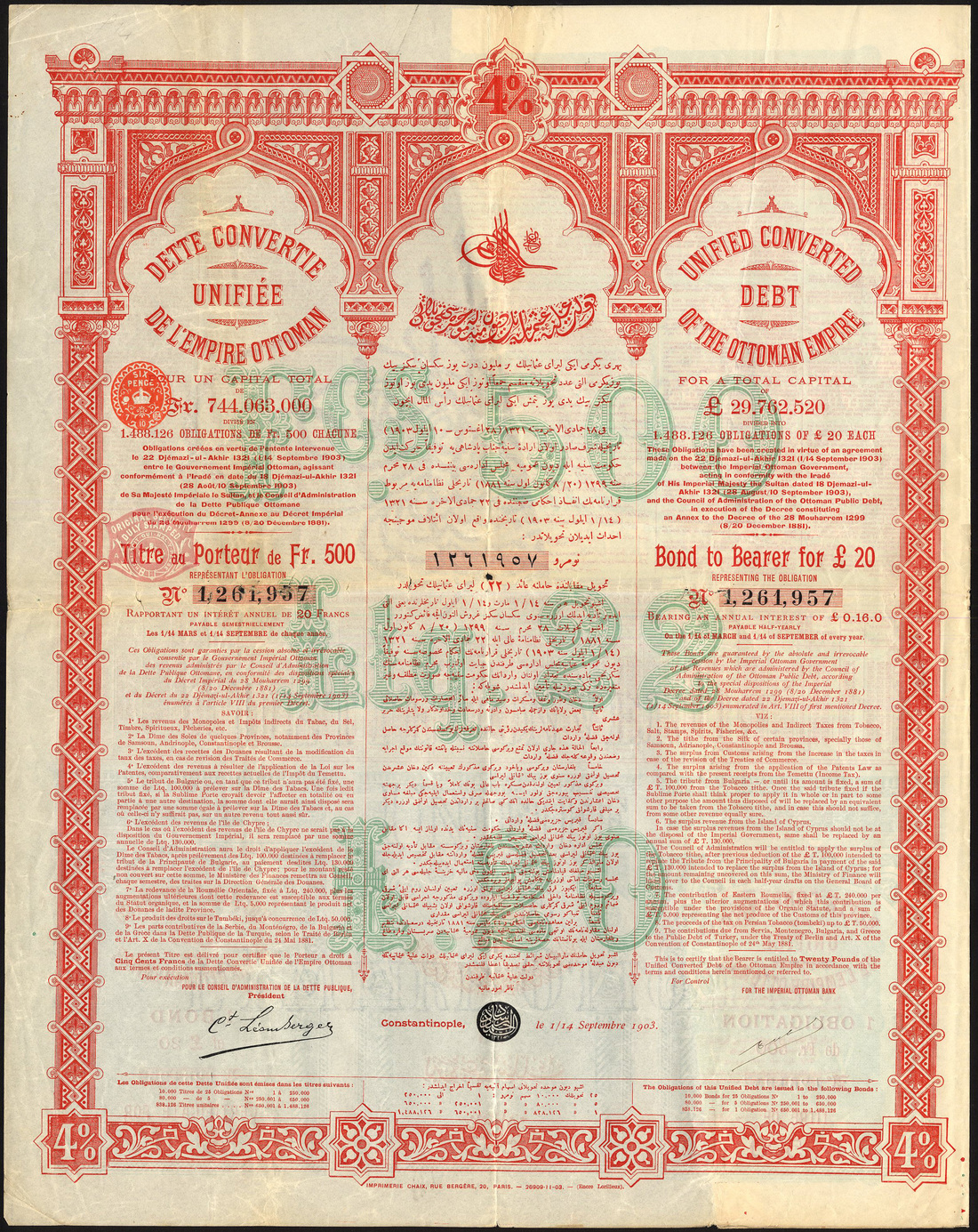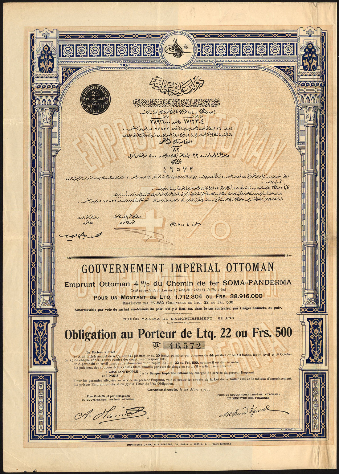 Ottoman 4% Loan for the Soma-Panderma Railway, T£22 or 500 franc bond, 1911, large format, together with Unified Converted Debt, 1903, bond for £20, very large format, red; Compagnie Generale d'Omnibus et d'Autobus de Constantiople, T£5 share, 1910, ornate border with horse drawn and motor buses, 2 examples; Ottoman Company Ltd., £20 share, 1865, 2 examples, others (2) and fractional certificates for arrears of interest on the 1928 loans, 1930 (9), generally very fine to extremely fine. (17)