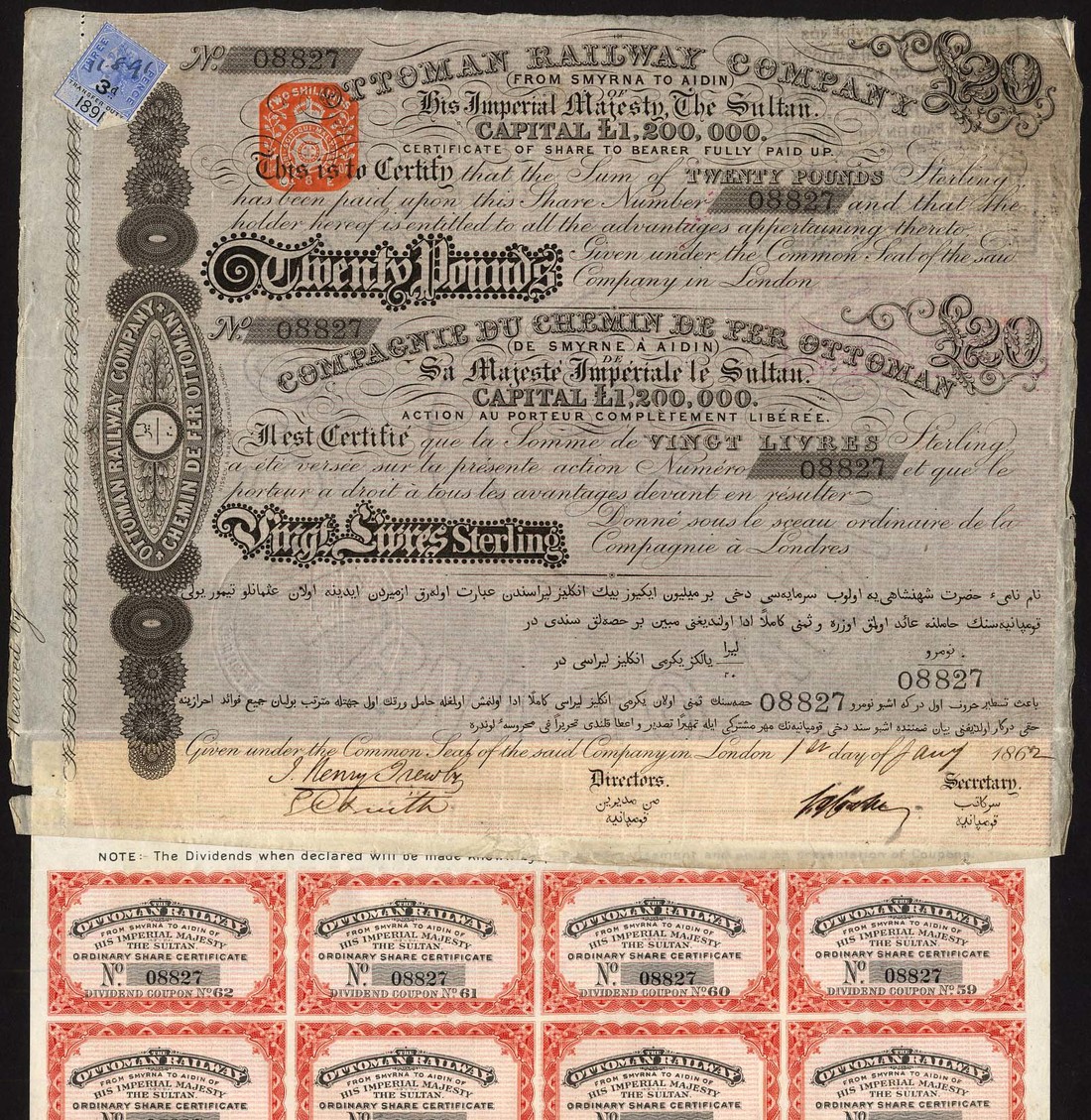 Ottoman Railway Company from Smyrna to Aidin, £20 share, London 186[2], no.08827, ornate scrollwork at left, text in English, French and Arabic, impressed and adhesive revenue stamps, coupons re-attached, good very fine;