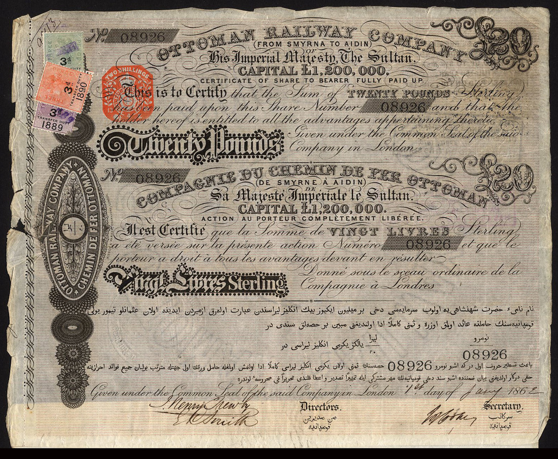 Ottoman Railway Company from Smyrna to Aidin, £20 share, London 186[2], no.08926, ornate scrollwork at left, text in English, French and Arabic, impressed and adhesive revenue stamps, coupons re-attached, old repaired tear at left edge and small hole by seal, very fine.