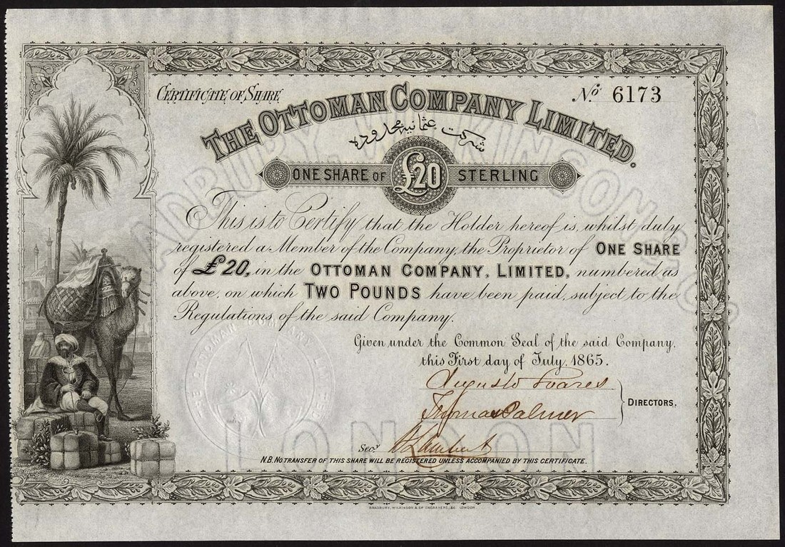 Ottoman Company Ltd., a group of 15 certificates for one share of £20, London 1865, lovely vignette of camel and rider with goods standing by palm tree, black, printed by Bradbury, Wilkinson & Co., generally extremely fine. (15)