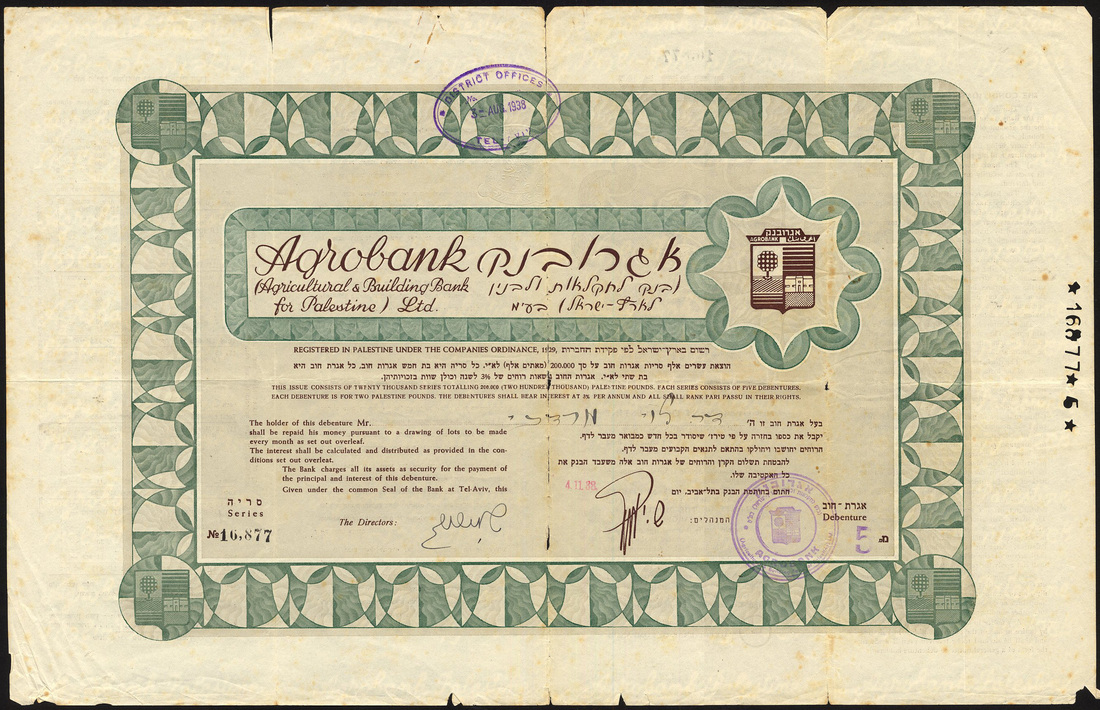 Agrobank (Agricultural & Building Bank for Palestine) Ltd.., debenture, [1938], no.16877, green and brown, text in English and Hebrew; together with other Palestine pieces comprising Marine Trust Ltd., P£1 ordinary shares, 193[7], no.6157, blue and green; Mizrahi Bank Ltd., ordinary share of E£1, 19[24], ornate border, blue, red seal, text in Hebrew and English, with talon, and Bank Zerubabel, debenture for P£5, green, all well circulated, the Mizrahi with small piece missing but generally fair to fine. (4)