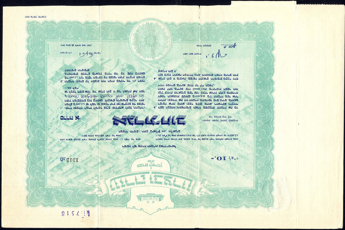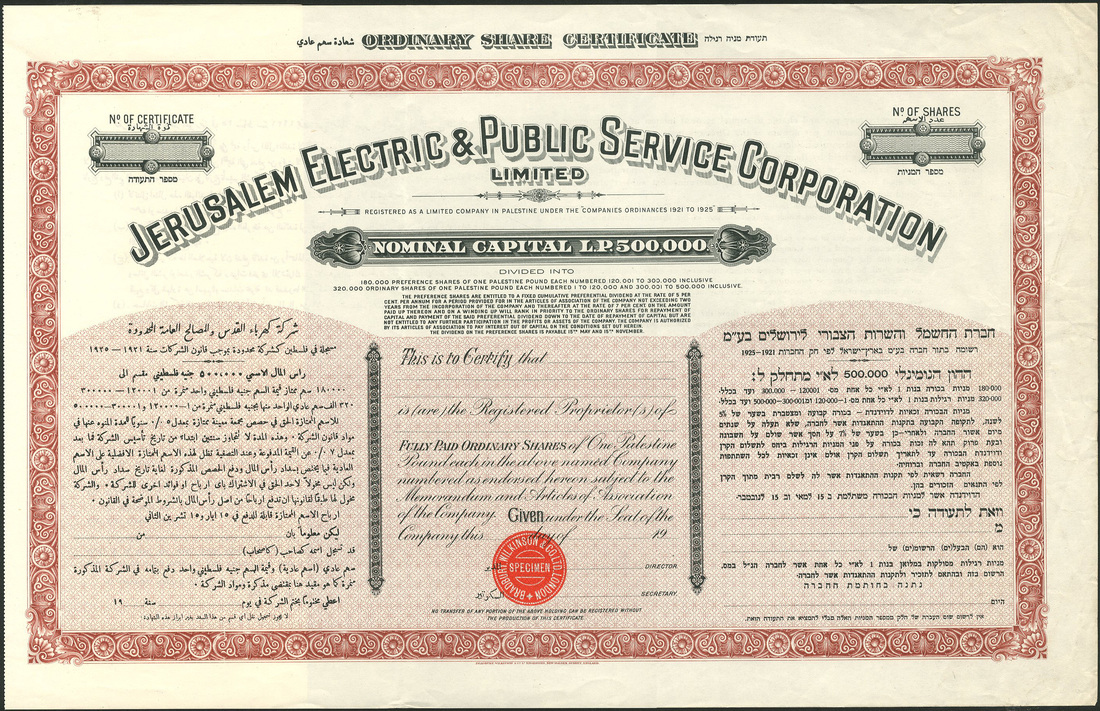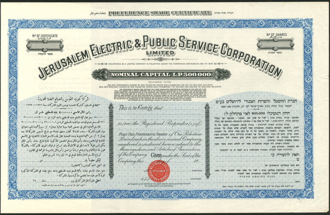 Jerusalem Electric & Public Service Corporation Limited, a pair of specimen share warrants from the Bradbury, Wilkinson & Co. archive, for ordinary and preference shares of £P1, 19- (circa 1925), large format pieces with ornate borders, brown and black, and blue and black respectively, text in Arabic, English and Hebrew, perforated cancelled, with counterfoils, extremely fine; together with Relief and Consolidation Housing Co. Ltd., P£10 debenture, 1947, no.1515, ornate border, underprint of housing estate, green and blue, text in Hebrew with English conditions on the reverse, Palestine embossed duty stamp, very fine. (3)