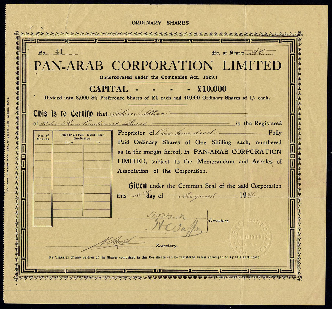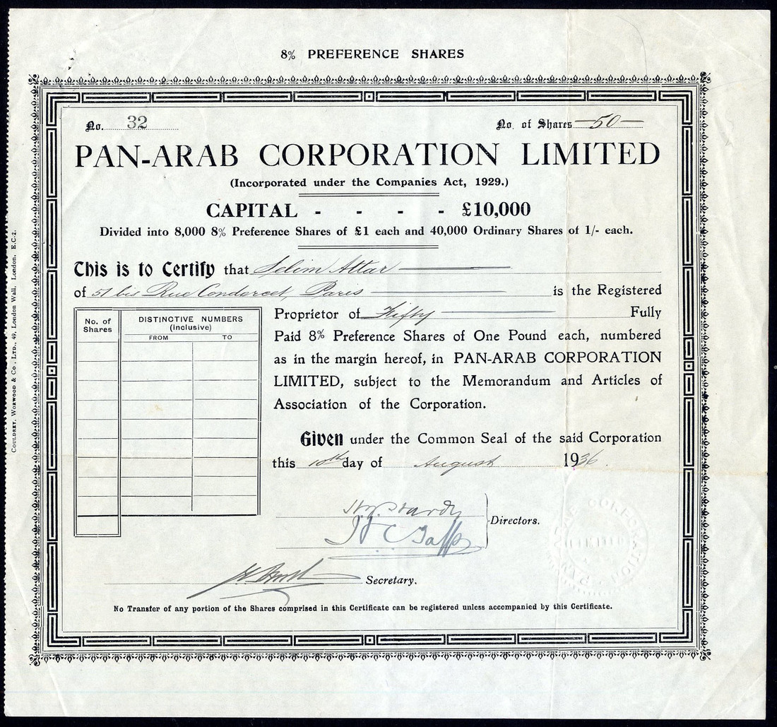 Pan-Arab Corporation Ltd., a pair of certificates for ordinary shares, no.41, black on buff paper and 8% preference shares, no.32, black, both dated 19[36], very fine. (2)