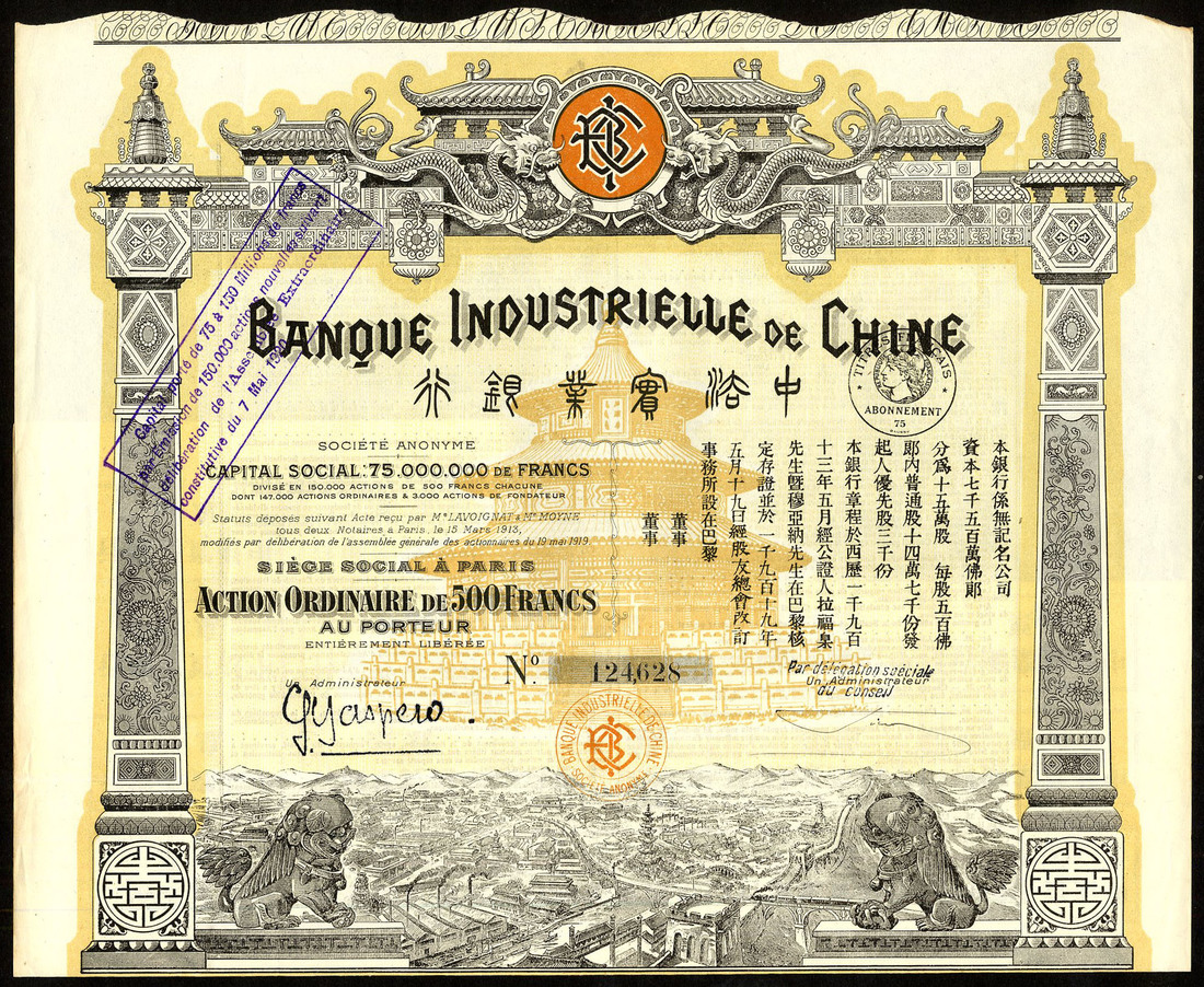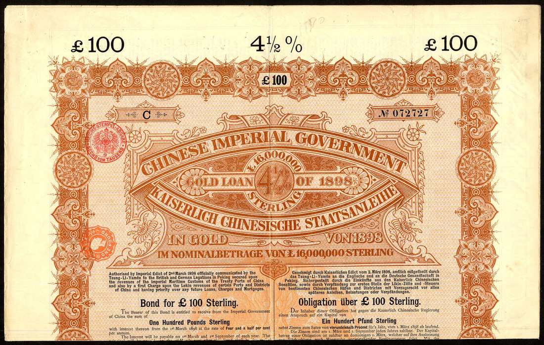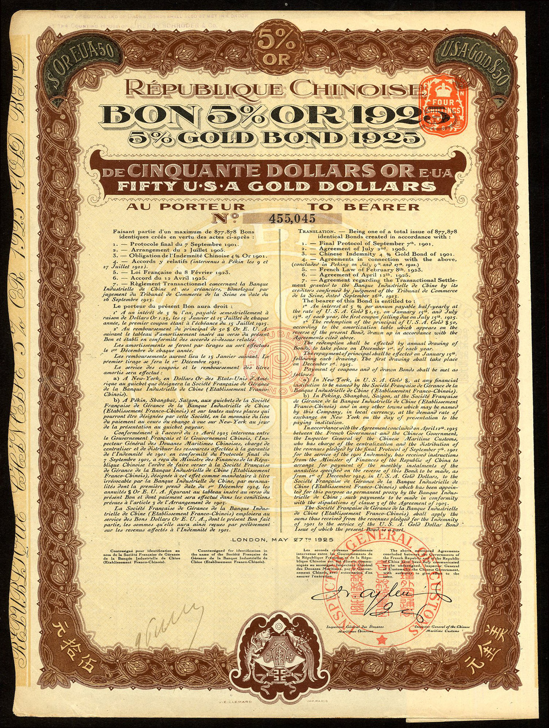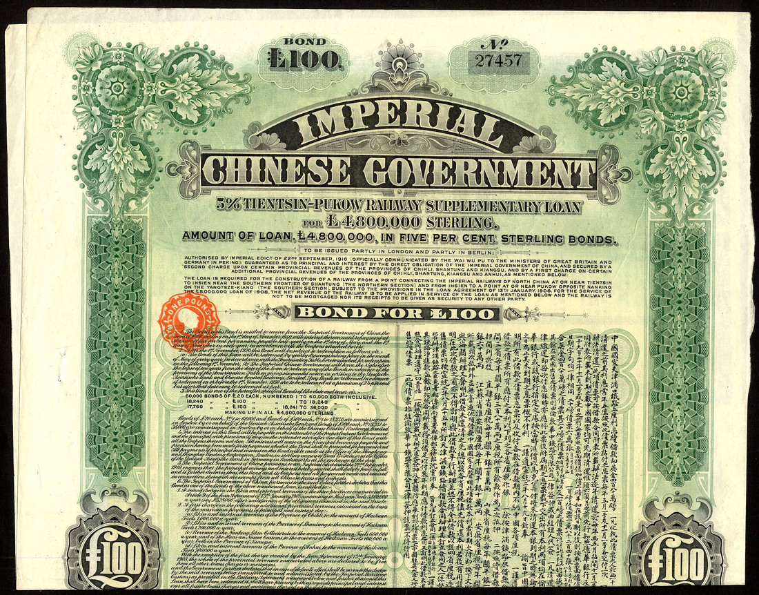 (x) A small group of Chinese bonds, comprising 1898 4½% Gold Loan, £100, German issue; Tientsin Pukow Railway, 1910, £100, English issue, green; 1925 5% Boxer Loan, $50; Shanghai Hangchow Ningpo Railway, 1936, £100 bond, Sun Yat Sen top right, and Banque Industrielle de Chine, 500 franc share, 1919, capital 75 million, all very fine and better. (5)