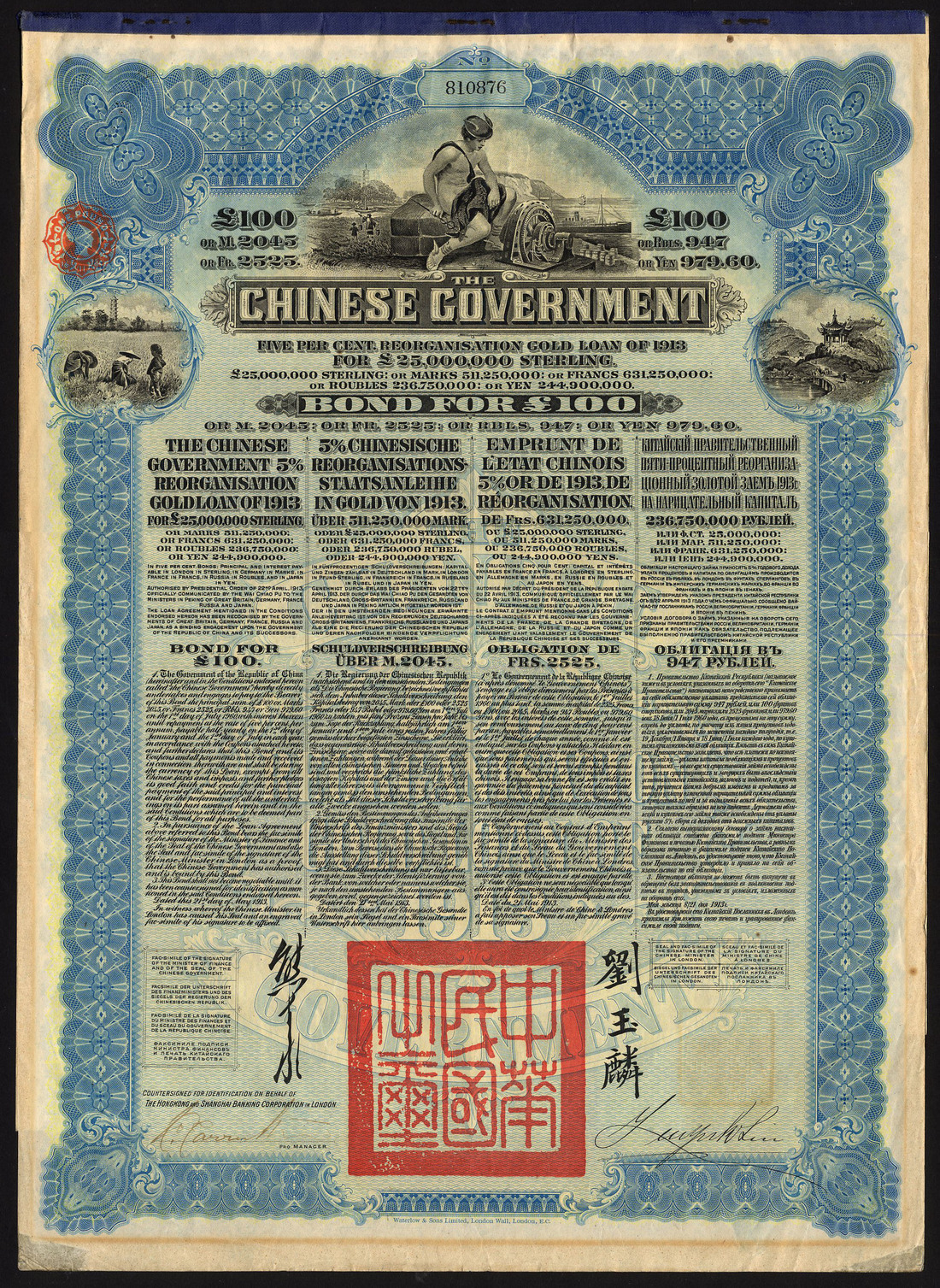 1913 5% Reorganisation Gold Loan, bonds for £100 and £20 (this lacking coupons), issued by the Hongkong and Shanghai Banking Corporation, £20 bonds, Russian issue, both green and brown examples (both lacking coupons), 1898 Gold Loan, £25 (this heavily toned), £50 and £100, German issue, and Tientsin Pukow Railway, 1910, £20, German issue, all removed from frames with light toning, mount marks on reverse, generally fine to very fine unless stated. (8)