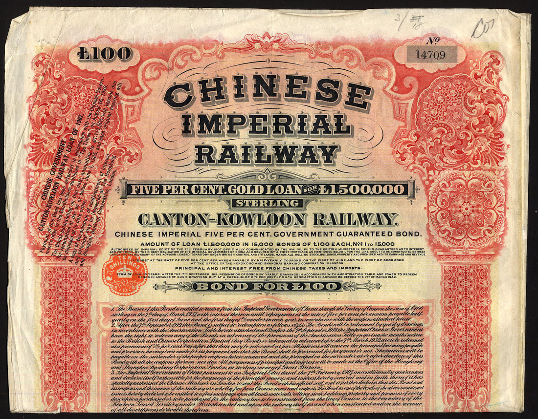 A collection of Chinese bonds (20), comprising 1898, Gold Loan, German issue, £25 (2) and £100 (4), English issue, £100; Shanghai Nanking Railway, £100, 1904; Canton Kowloon Railway, £100, 1907; Tientsin Pukow Railway, 1908, German issue, £20 (3) and £100; Hukuang Railway, 1911, £20, French issue and £100, English issue, and, 1912 Gold Loan, £20 (4) and £100, also a Shanghai Nanking Railway net-profit sub-certificate and 5 fractional certificates, mixed condition, fine to very fine. (26)