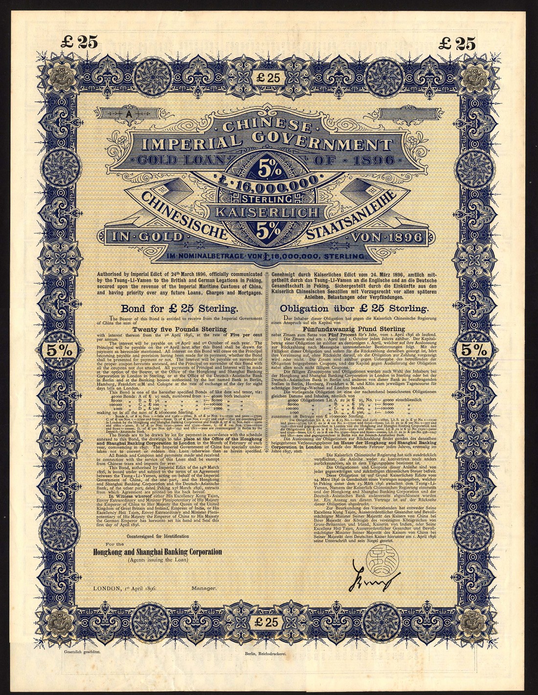 Chinese Imperial Government, 1896 5% Gold Loan, unissued bond for £25, countersigned by Hongkong and Shanghai Banking Corporation, large format piece, blue with multicoloured underprint, with full coupons sheet, minor creasing in lower left margin with light foxing, extremely fine and extremely rare.