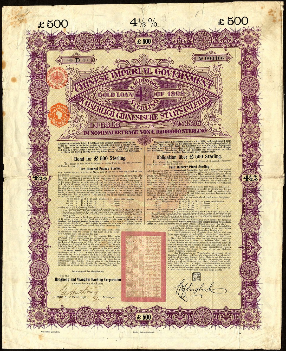 1898, 4½% Gold Loan, £500 bond, no.000466, issued by the Hongkong and Shanghai Banking Corporation, large format, ornate border, mauve and black, red chop in centre, with coupons, couple of small tears at top edge, fine and scarce.