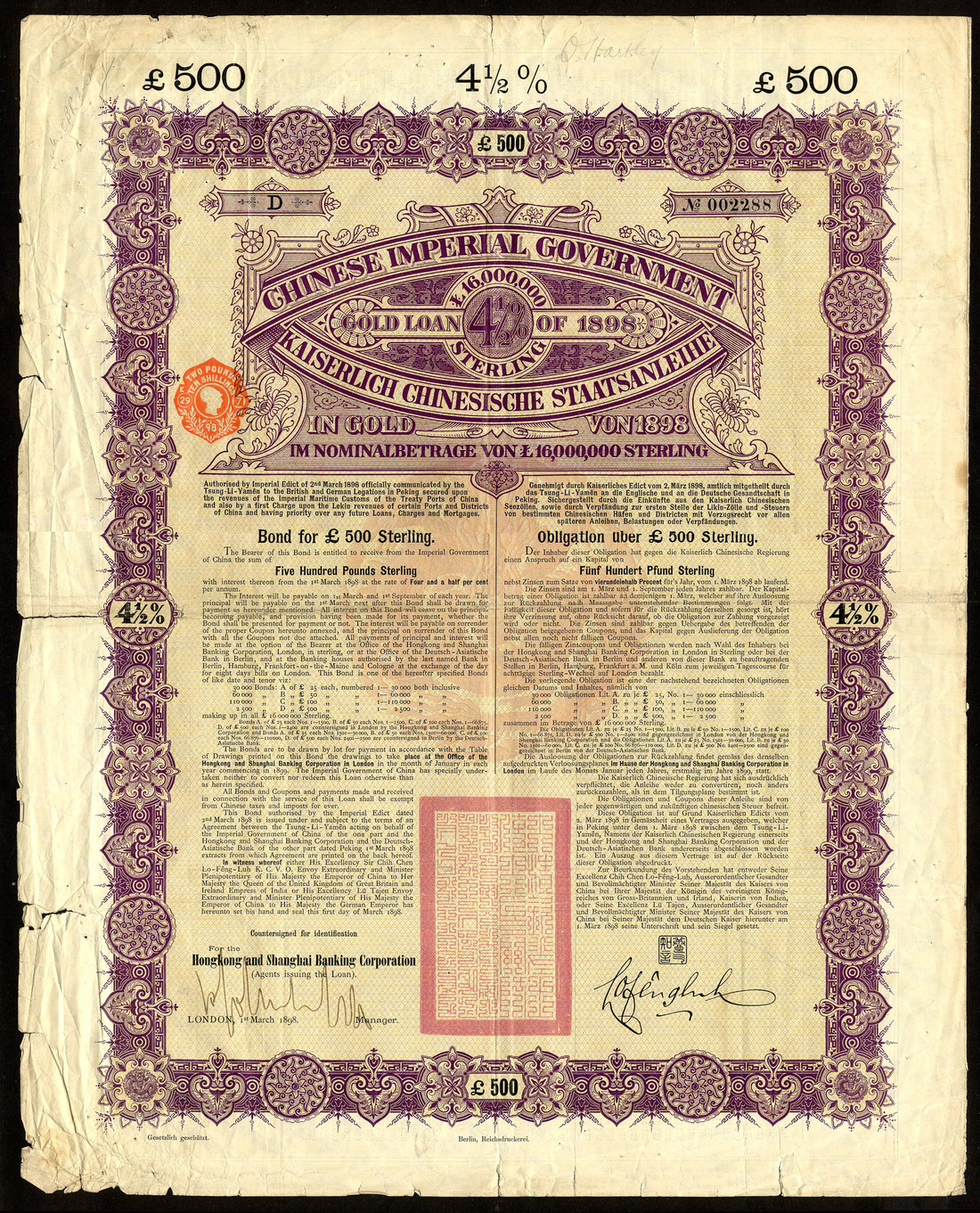 1898, 4½% Gold Loan, £500 bond, no.002288, issued by the Hongkong and Shanghai Banking Corporation, large format, ornate border, mauve and black, red chop in centre, with coupons, edge tears but no paper loss, fine and scarce.