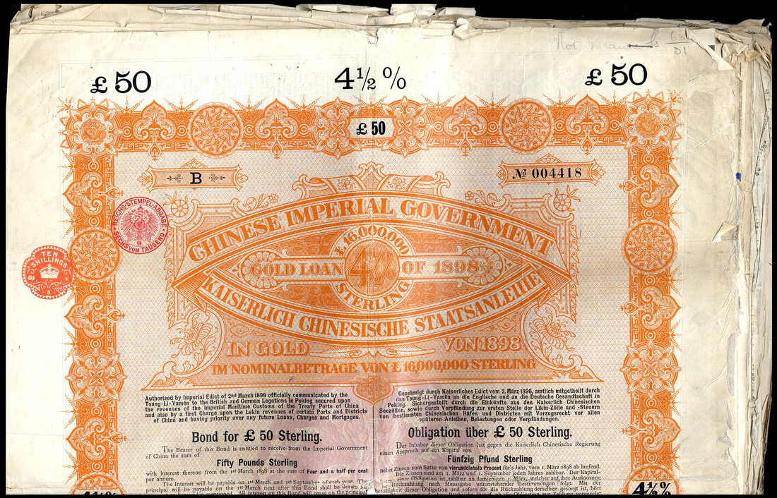 1898 4½% Gold Loan, a group of 30 bonds for £50, issued by the Deutsch-Asiatische Bank, large format, ornate borders, orange and black, red 'chop' in centre, with coupons, mixed condition but most fine to very fine. (30)