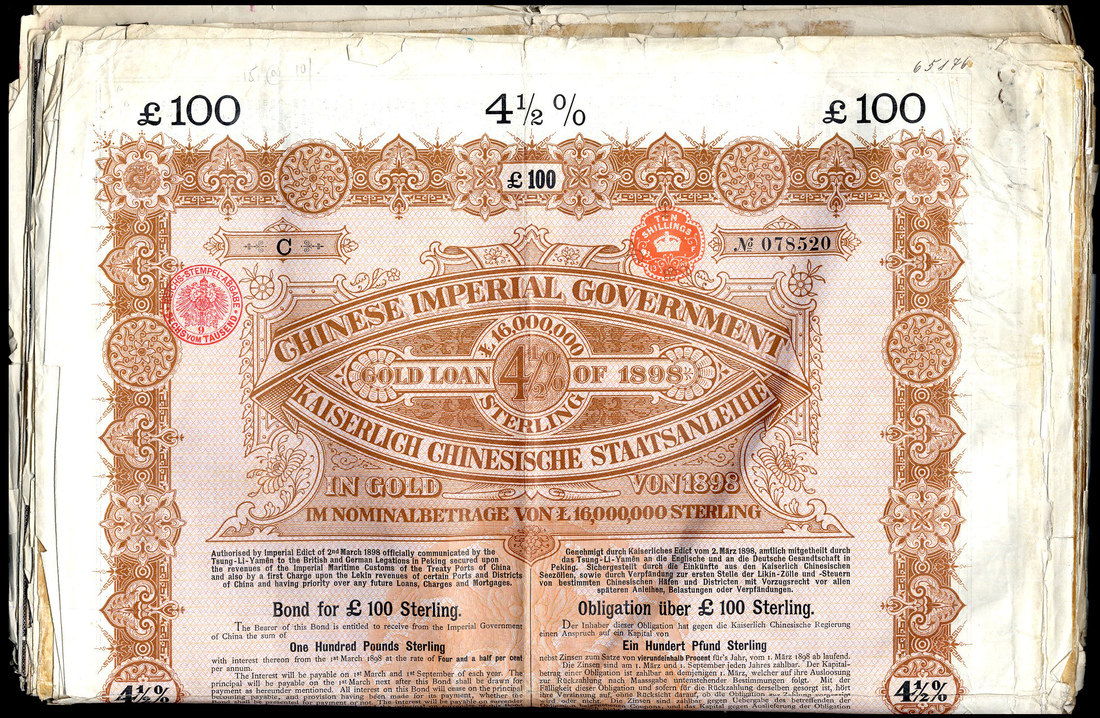 1898 4½% Gold Loan, a group of 35 bonds for £100, issued by the Deutsch-Asiatische Bank, large format, ornate borders, brown and black, red 'chop' in centre, with coupons, mixed condition but most fine to very fine. (35)