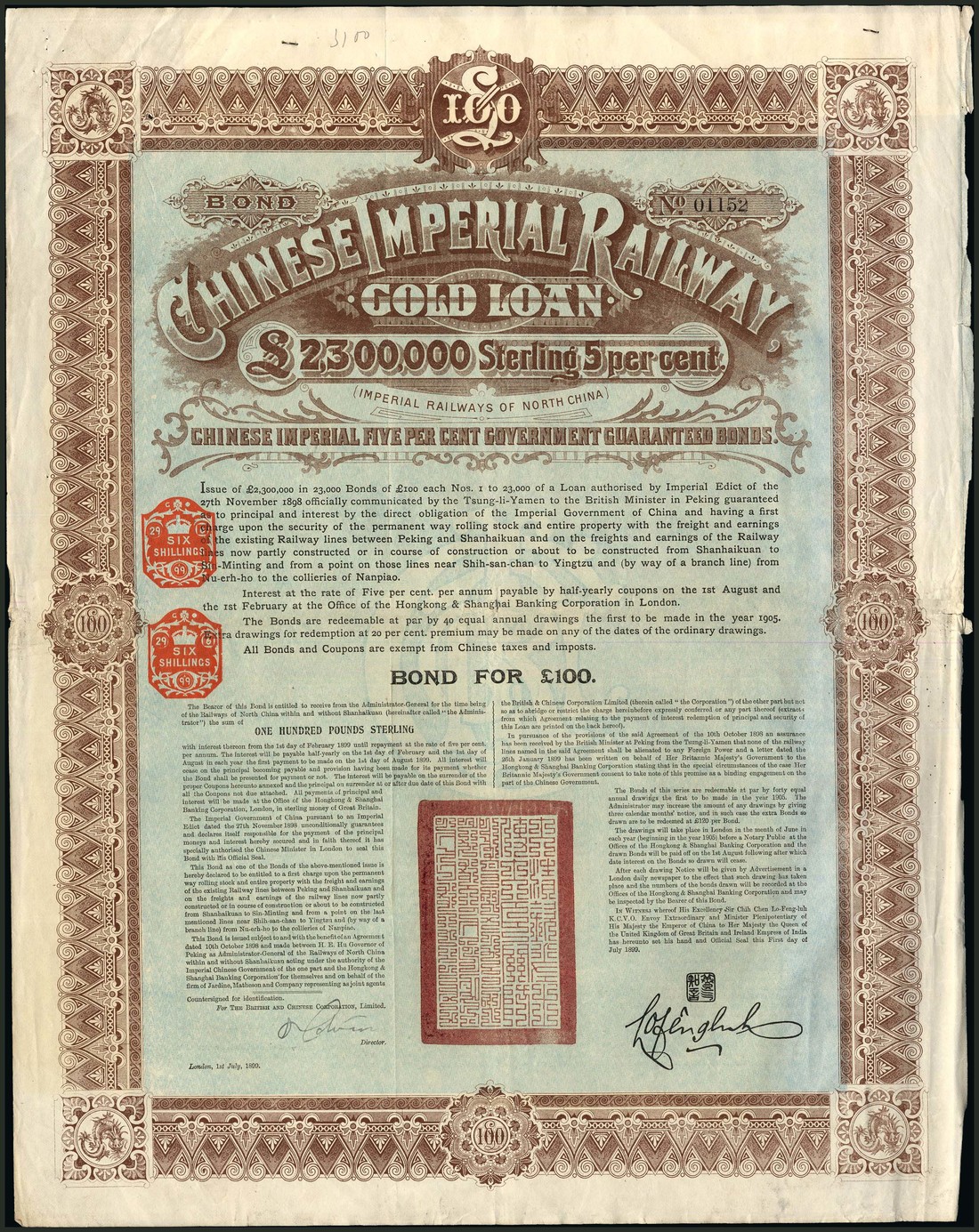 1899, Chinese Imperial Railway, Railways of North China, 5% Gold Loan, £100 bond, no.01152, very large format piece with ornate border, brown with blue underprint, with coupons (K.90), very fine