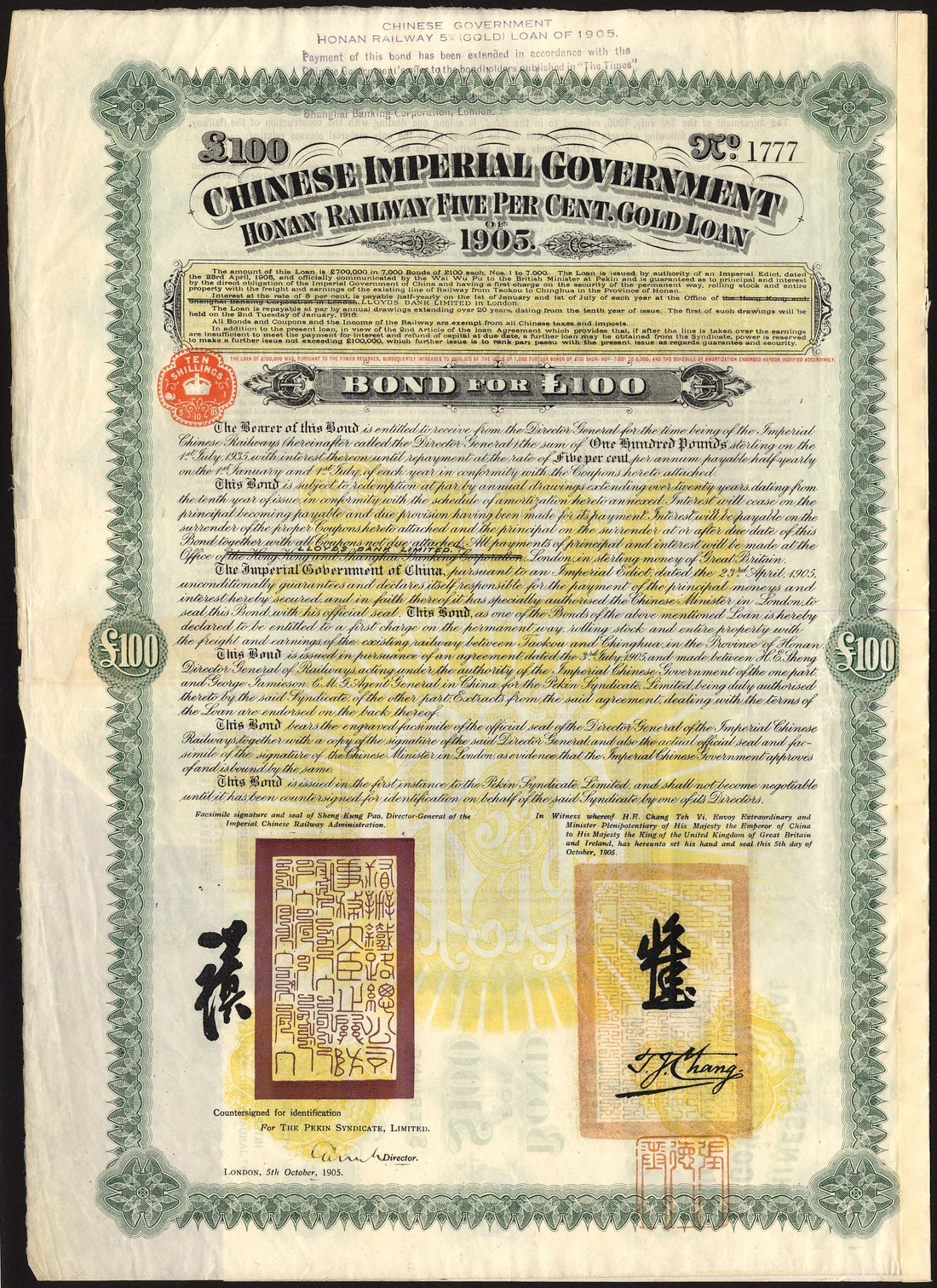 Chinese Imperial Government, Honan Railway 5% Gold Loan, bond for £100, first issue, 1905, no.1777, large format, ornate border, green and black with yellow underprint, coupons glued at right edge, red 'chop' at top right, good very fine