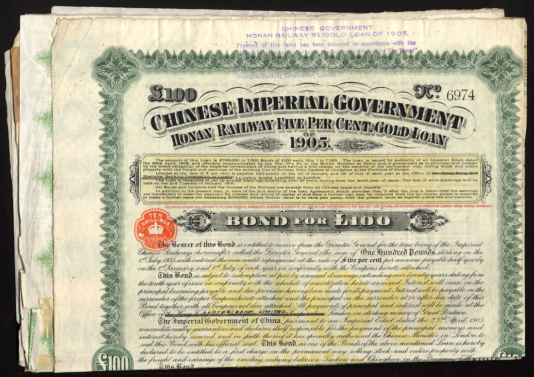 Honan Railway 5% Gold Loan, 1905, a group of 3 bonds for £100, all first issue, large format, ornate border, green and yellow, with coupons, generally very fine. (3)