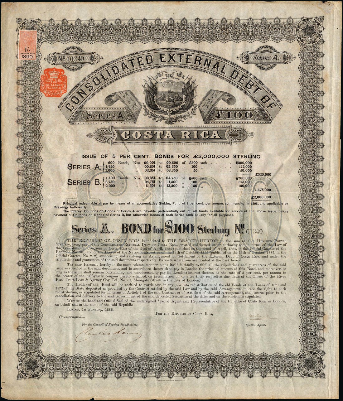 Consolidated External Debt of Costa Rica, 5% Loan, 1886, bond for £100, no.01340, large format piece with coat of arms at top, black with blue '£100' in underprint, text all in English, no coupons, not cancelled, removed from a frame, a little faded and toned, somewhat brittle but about very fine and very rare.