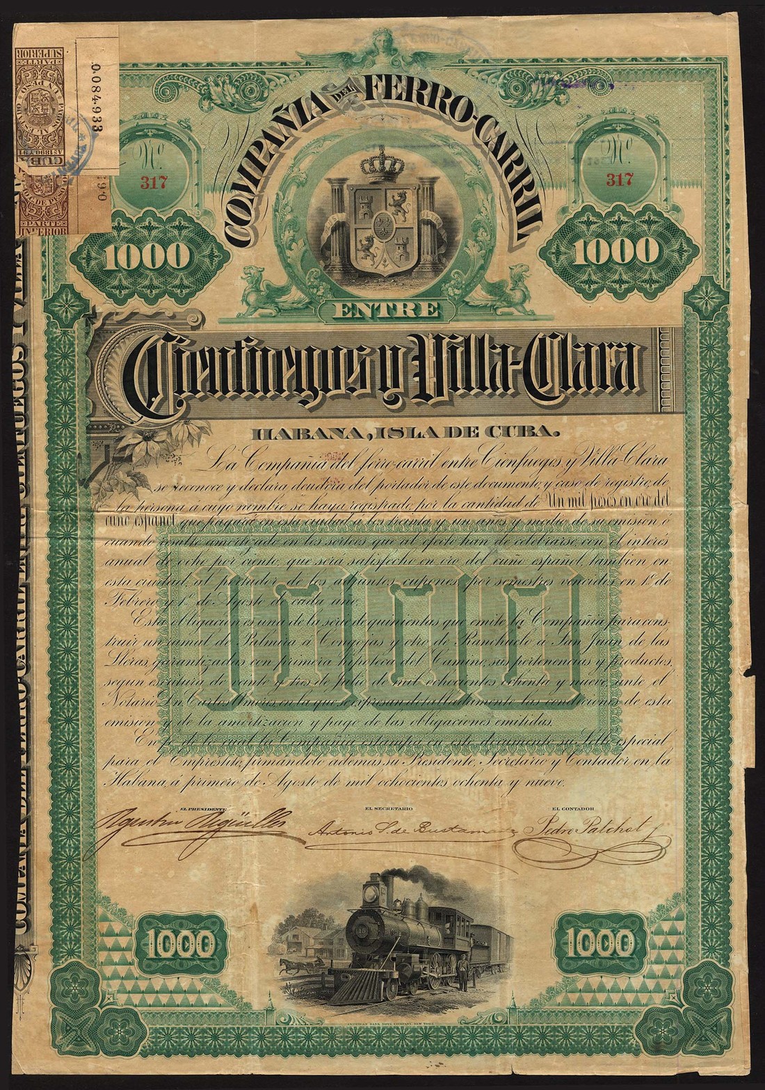 Compania del Ferro-Carril Cienfuegos y Villa-Clara, 8% bond, 1000 pesos, 1889, no.317, large format piece with steam train at bottom, Cuban arms at top, green and black, with coupons, folds, lightly toned overall but about very fine.