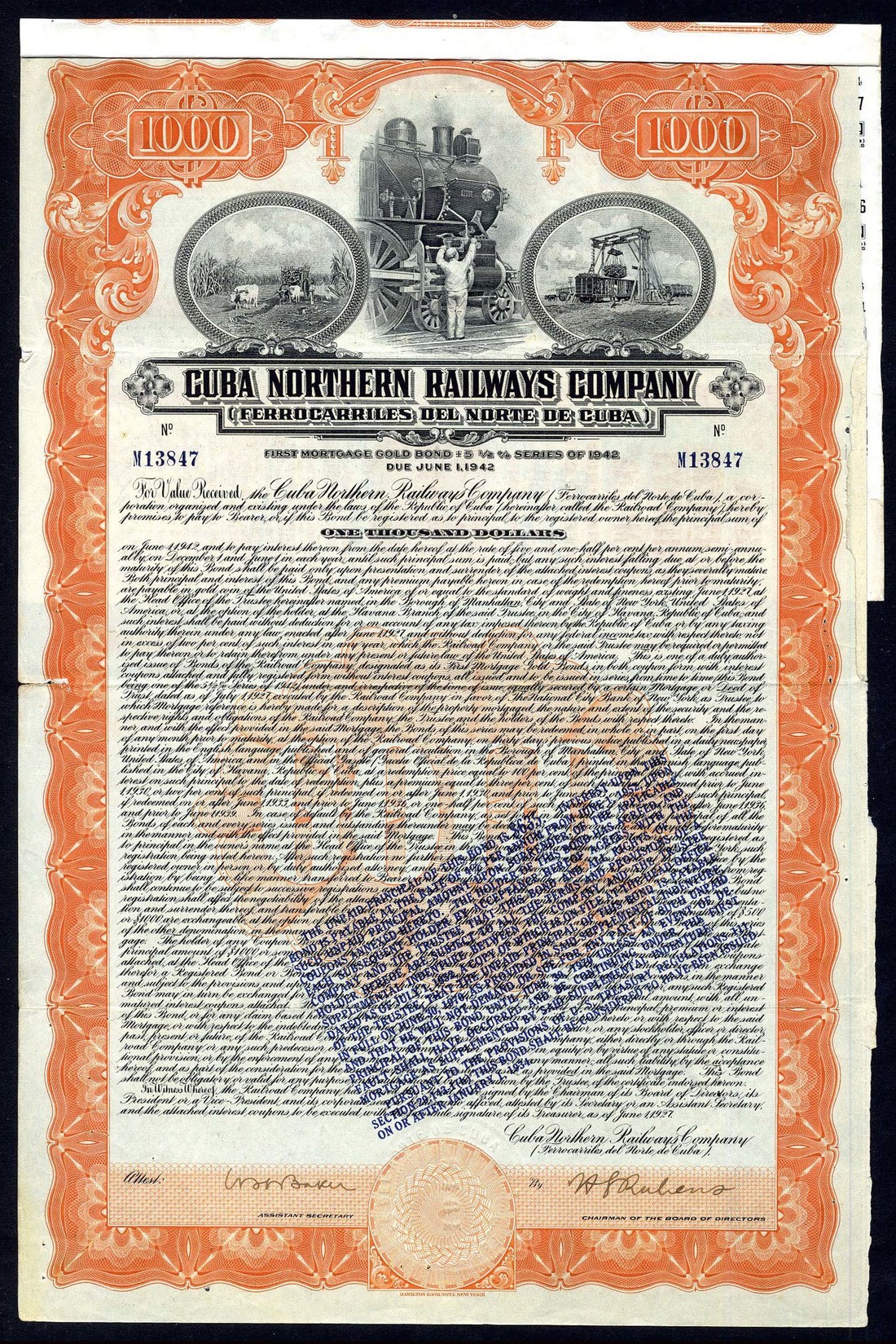 Cuba Northern Railways Company, First Mortgage 5½% gold bond, $1000, 1927, no.M13847, engineer with locomotive in centre, wagon load of sugar cane to left, loading railroad trucks to right, orange and black, endorsement on face showing reduction in principal to $635, with coupons, small split at folds, very fine.