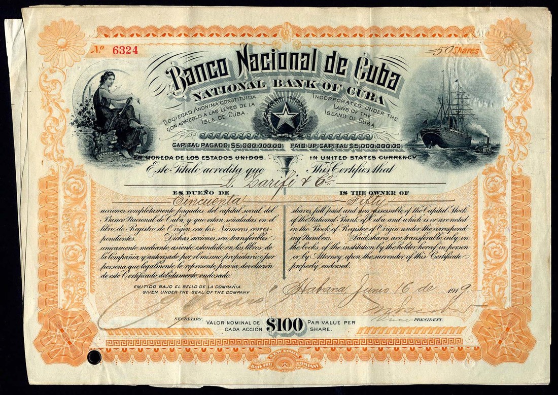 Banco Nacional de Cuba, a group of 10 certificates for $100 shares, all issued to Zarifi & Co. and all dated 191[9], allegorical female at left, steamship at right, orange and black, text in Spanish and English, attached in two groups of 5 certificates by contemporary rivets, generally very fine. (10)