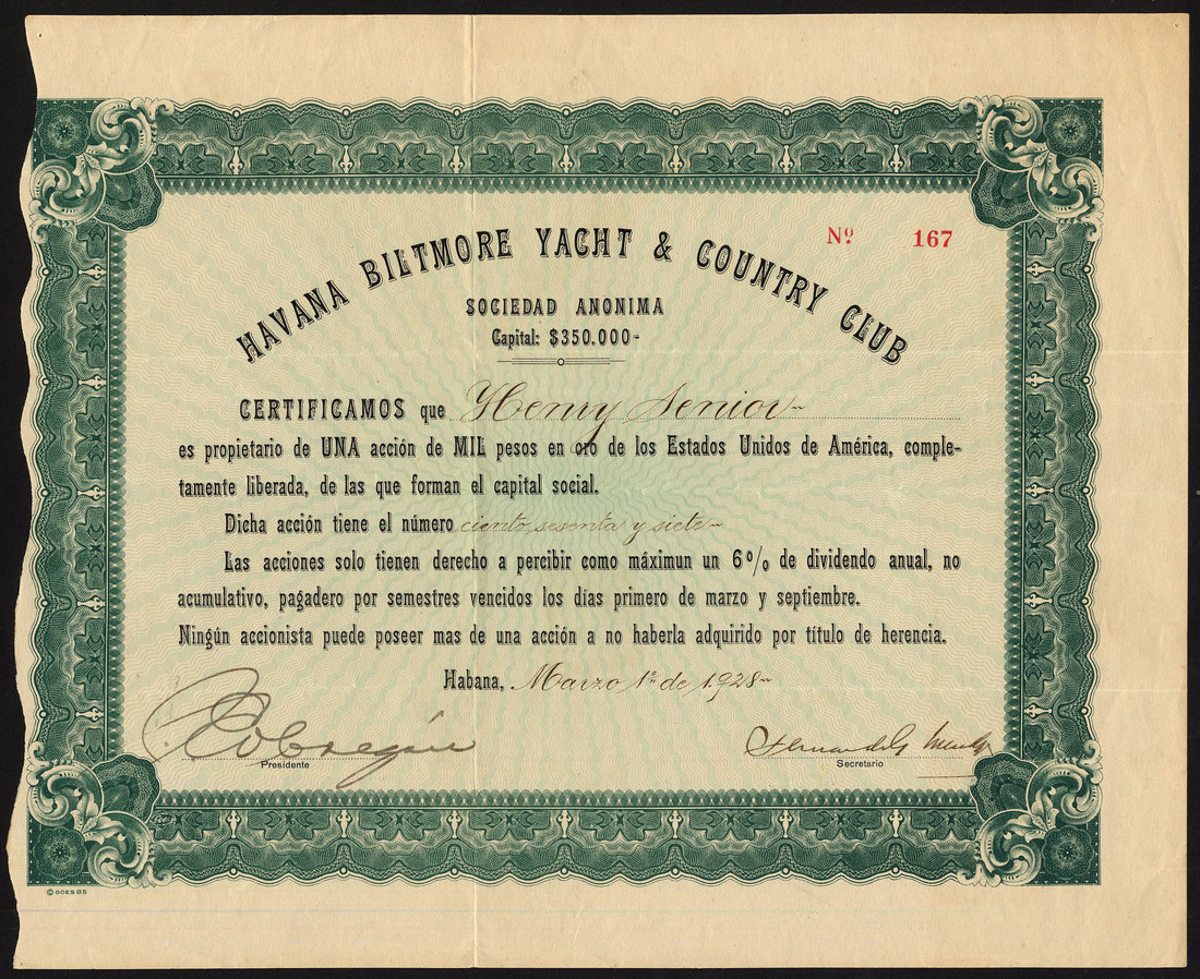 Havana Biltmore Yacht and Country Club, 1000 peso share, Havana [1928], no.167, ornate border, green and black, very fine and scarce.