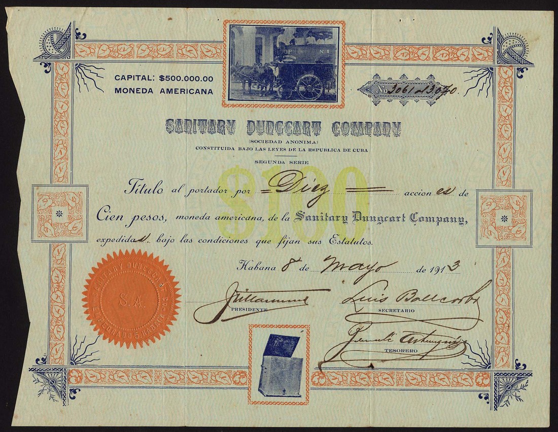 Sanitary Dungcart Company, 100 peso shares, Havana 191[3], no.3061-70, vignette of horse-drawn cart at top, dung cart at bottom, ornate border, blue and red, red seal, pale blue underprint, good very fine.