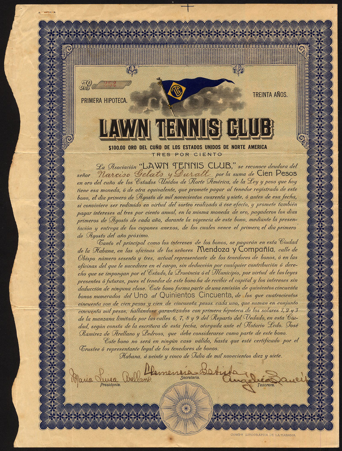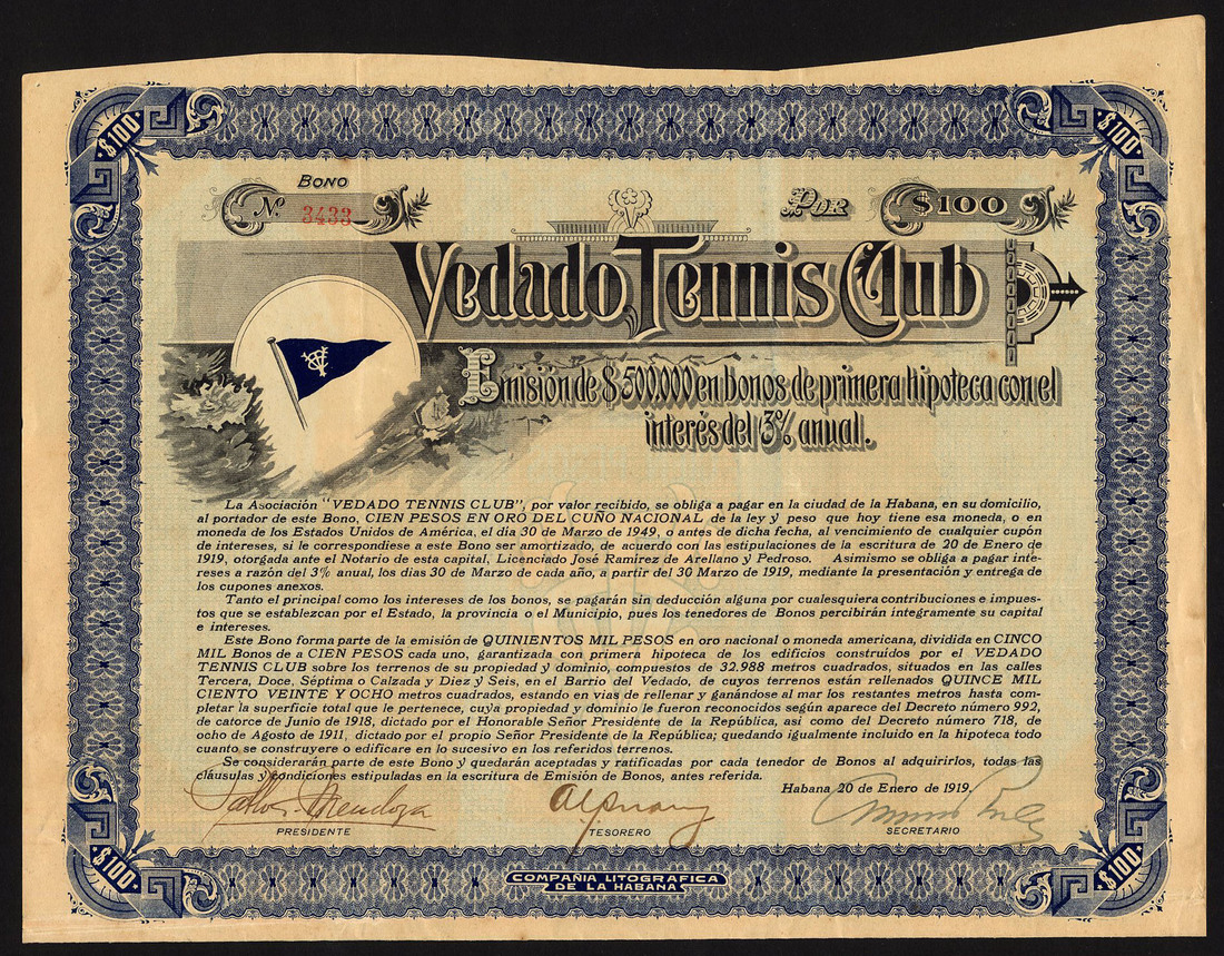 Pair of Cuban Tennis Club certificates: Vedado Tennis Club, 3% Bond, 1919, $100, no.3433, ornate border, club flag top left, blue and black, with coupons; Lawn Tennis Club, 3% bond, 1916, 100 pesos, no.262, Club flag at top, ornate border, blue and black, with coupons, both very fine. (2)