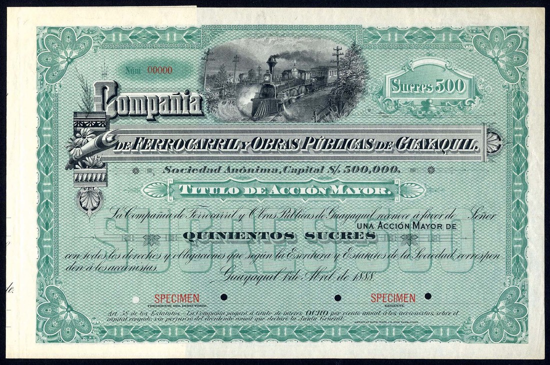 Compania de Ferrocarril y Obras Publicas de Guayaquil, a specimen certificate for 500 sucre share, Guayaquil 1888, steam train at top, green and black, overprinted SPECIMEN over signature areas, with counterfoil, almost extremely fine.