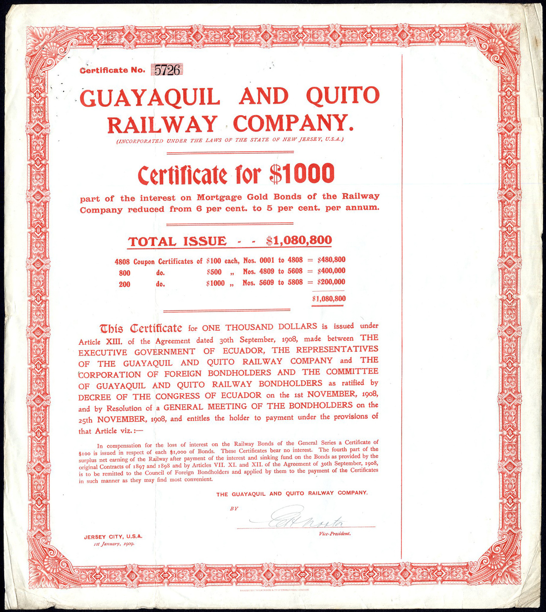 Guayaquil and Quito Railway Co., a series of non interest bearing certificates for $100 (2), $500 (2) and $1000 (3), Jersey City 1909, large format, green, blue and red respectively, generally fine to very fine, the last rare with only 200 issued. (7)