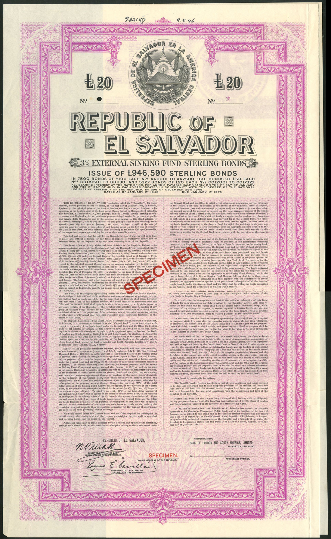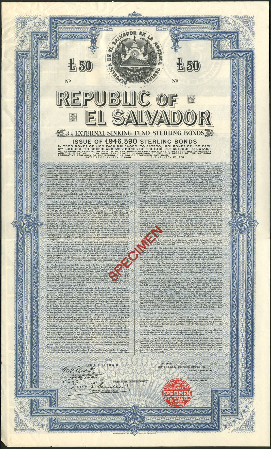 Republic of El Salvador, 3% External Sinking Fund Sterling Loan of 1946, a pair of specimen bonds for £20 and £50 from the Bradbury, Wilkinson & Co. archive, very large format piece with arms of El Salvador at top, ornate border, pink and blue respectively, text all in English, with coupons, overprinted specimen in red, top left corner a little crinkled on the £50 otherwise about extremely fine. (2)