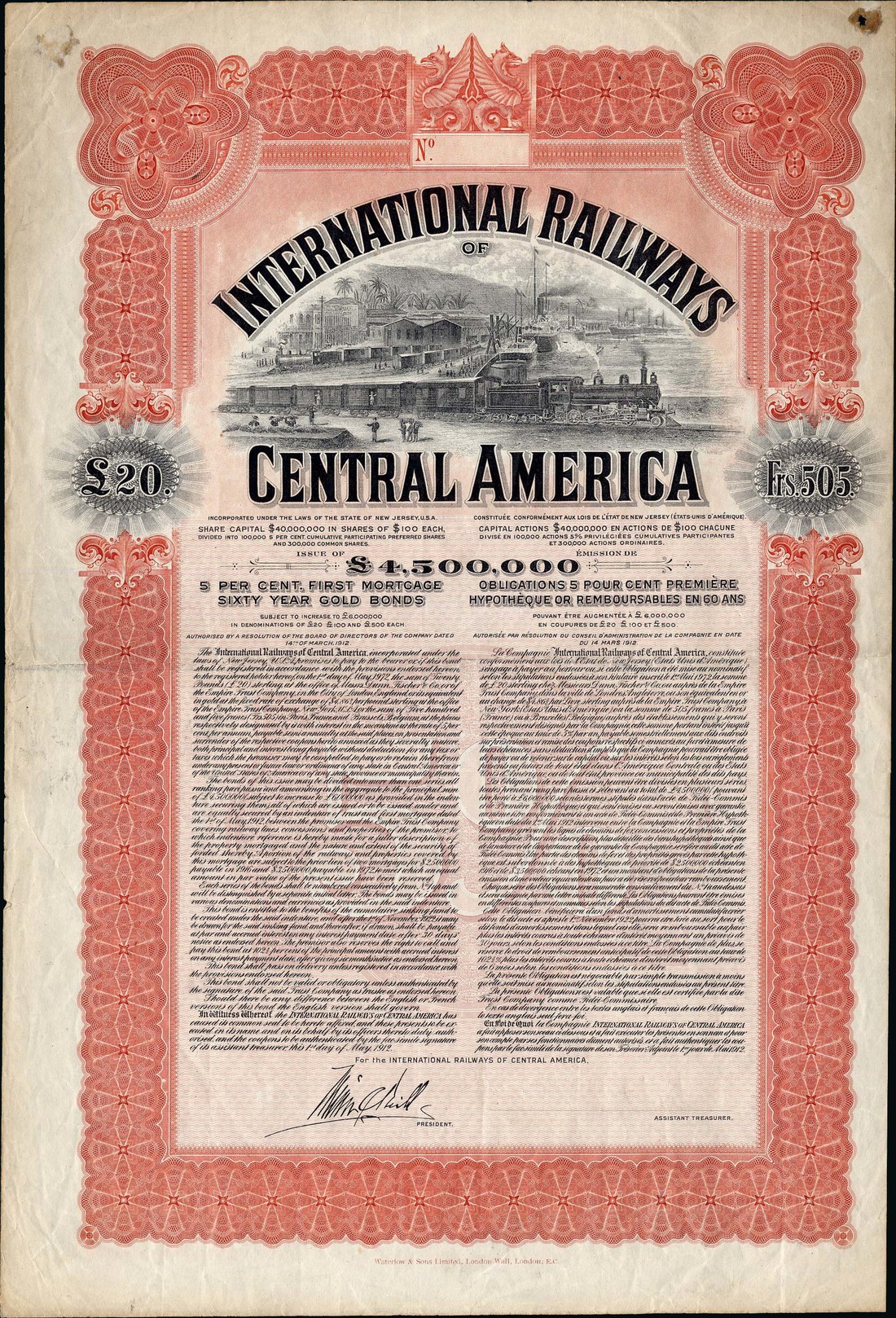 International Railways of Central America, 5% First Mortgage Gold Loan, 1912, unissued bond for £20 or 505 francs, large format, steam train at dockside, red and black, printed by Waterlow & Sons, no coupons, removed from a frame, a little faded and a little brittle but very fine and rare.