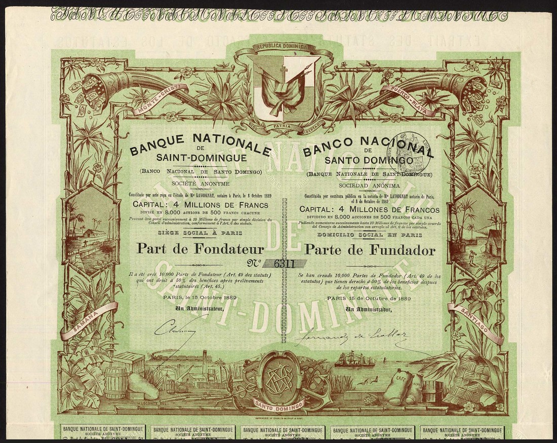 Banque Nationale de Saint-Domingue (Banco Nacional de Santo Domingo), a group of 7 founders shares, Paris 1889, ornate border of dockside scenes, native village, steamship and steam train, coat of arms at top, green, brown and black, text in French and Spanish, with coupons, nearly extremely fine. (7)
