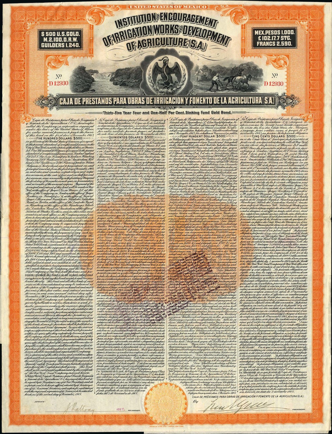 Institution for Encouragement of Irrigation Works and Development of Agriculture, 35-Year 4½% Gold Loan, a set of bonds for $100, $500 and $1000, 1908, large format, Mexican eagle at top, horse and plough to the right, dam to the left, ornate borders, green, orange and olive respectively, with coupons, very fine or nearly so. (3)