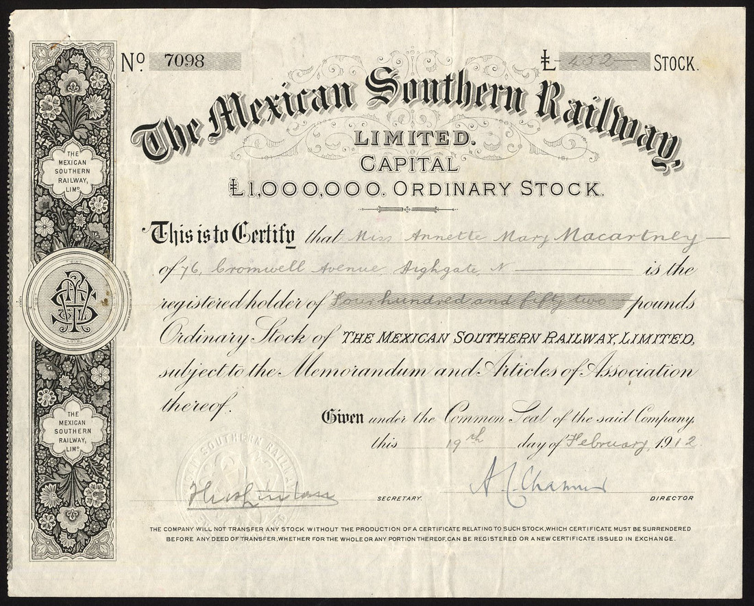 Mexican Southern Railway Ltd., ordinary stock, 19[12], black, printed by Waterlow; together with other Mexican certificates (20) and British companies operating in Mexico (21), dating from the late 19th century to 1949, mixed condition but many fine and a few very fine. (42)