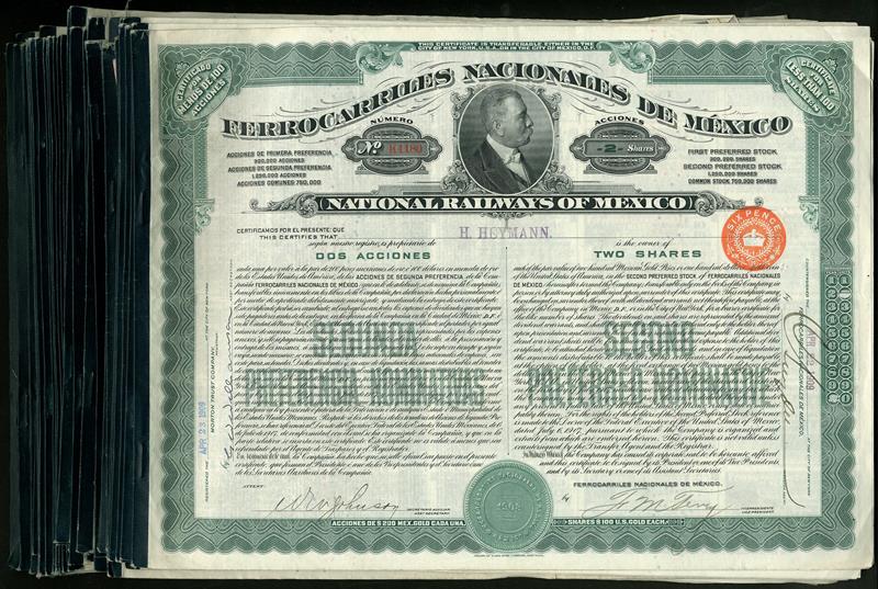 National Railways of Mexico (Ferrocarriles Nacionales de Mexico), a group of Second Preferred Nominative stock certificates, all [1909], Morton Trust Company, for 'less than 100 shares', printed 'two shares' (10) and 'four shares' (60), with portrait of Diaz in centre, green, with coupons, generally very fine and better. (70)