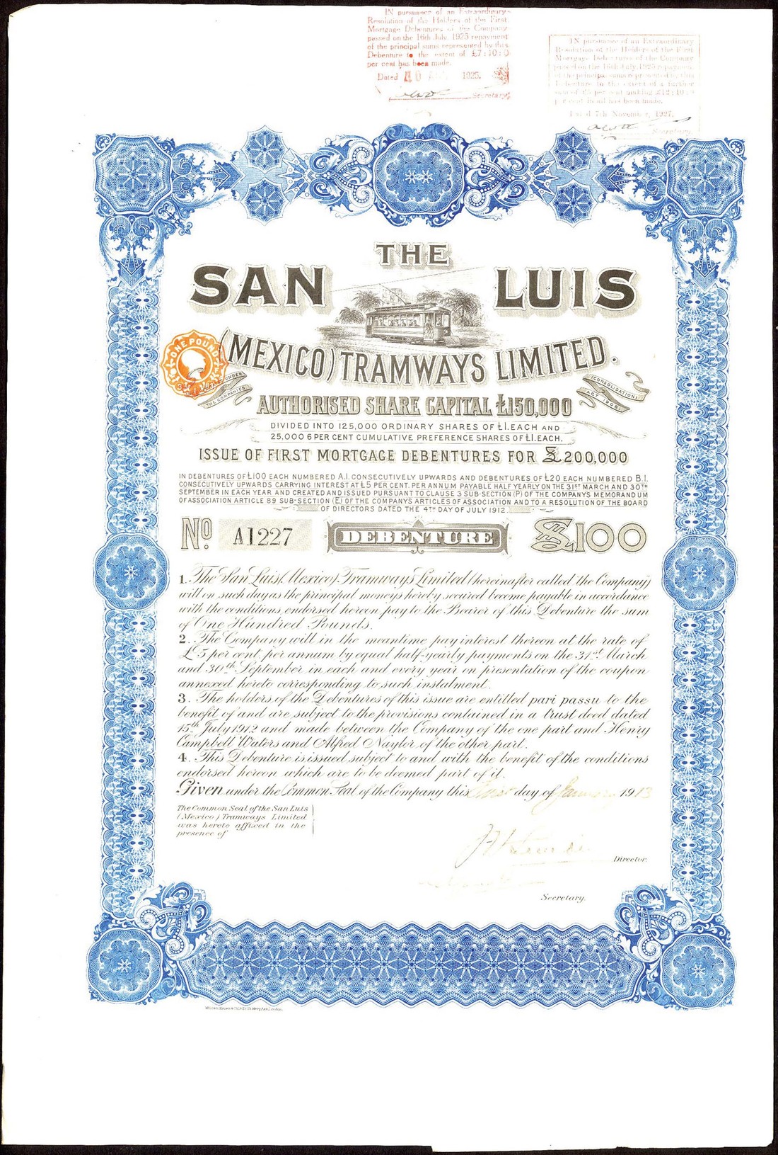San Luis (Mexico) Tramways Limited, pair of First Mortgage debentures for £20, no.B407 and £100, no.A1227, large format with vignette of electric tram at top, ornate borders, brown and black and blue and black, with coupons, good very fine.(2)