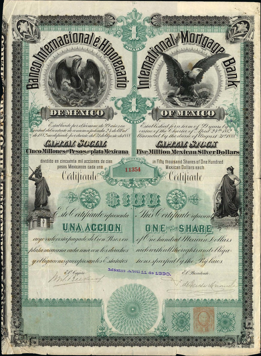 Banco Internacional é Hipotecario de México, 1 share of 100 pesos, [1890], no.11354, very attractive piece in both Spanish and English, Mexican and American eagles at top, allegorical female and native American at either side, green and black, printed by ABNCo., with coupons, small split at fold at left edge, very fine and rare