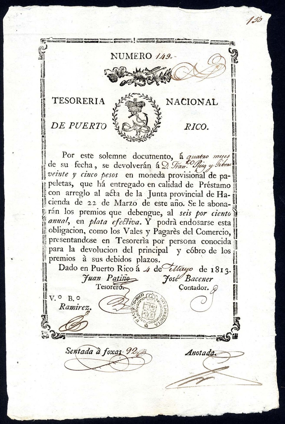 Puerto Rico, National Treasury, 6% Loan for 25 pesos, 1813, no.149, ornate border, arms at top, black, several hand signatures of officials, extremely fine.
