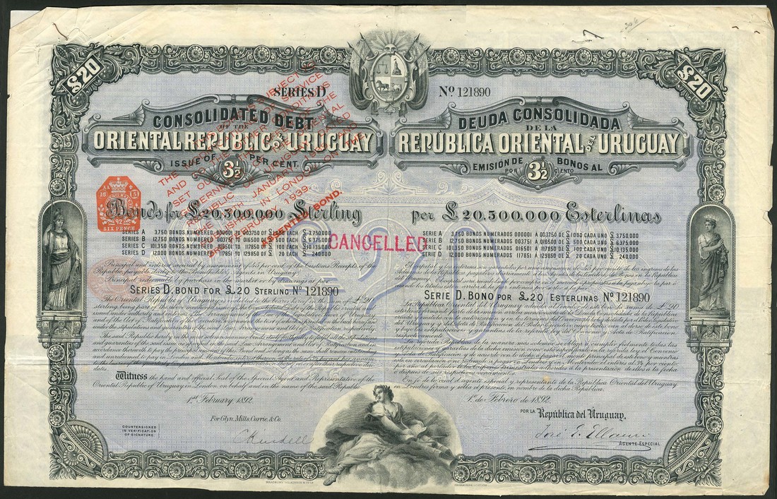 Oriental Republic of Uruguay, 1892 3½% Consolidated Debt, bond for £20, no.121890, large format, coat of arms at top, allegorical figures in borders, blue and black, text in English and Spanish, printed by Bradbury, Wilkinson & Co., stamped with modified terms of 1939, with replacement coupons, stamped CANCELLED, fine to very fine and scarce.