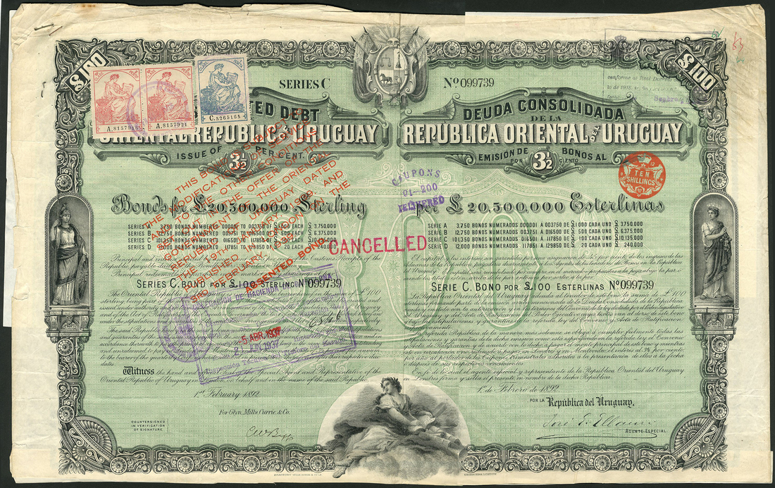 Oriental Republic of Uruguay, 1892 3½% Consolidated Debt, bond for £100, no.099739, large format, coat of arms at top, allegorical figures in borders, green and black, text in English and Spanish, printed by Bradbury, Wilkinson & Co., stamped with 1939 modified terms, with replacement coupons, stamped CANCELLED, fine to very fine and scarce.