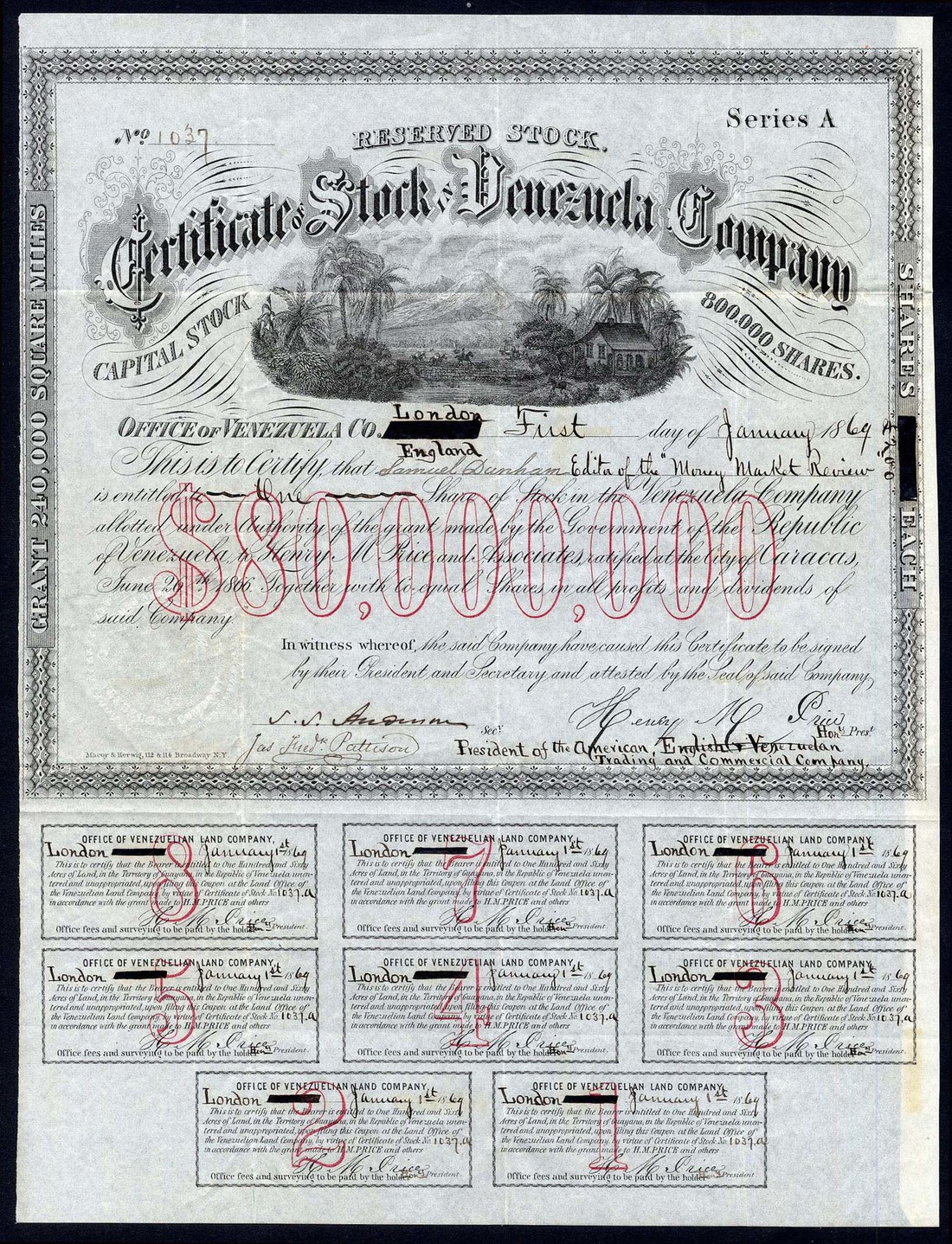 Venezuela Company, £200 shares, 18[69], no.1037, lovely vignette of the Venezuelan countryside, black, printed in New York, red underprint $80,000,000, with coupons, very fine.