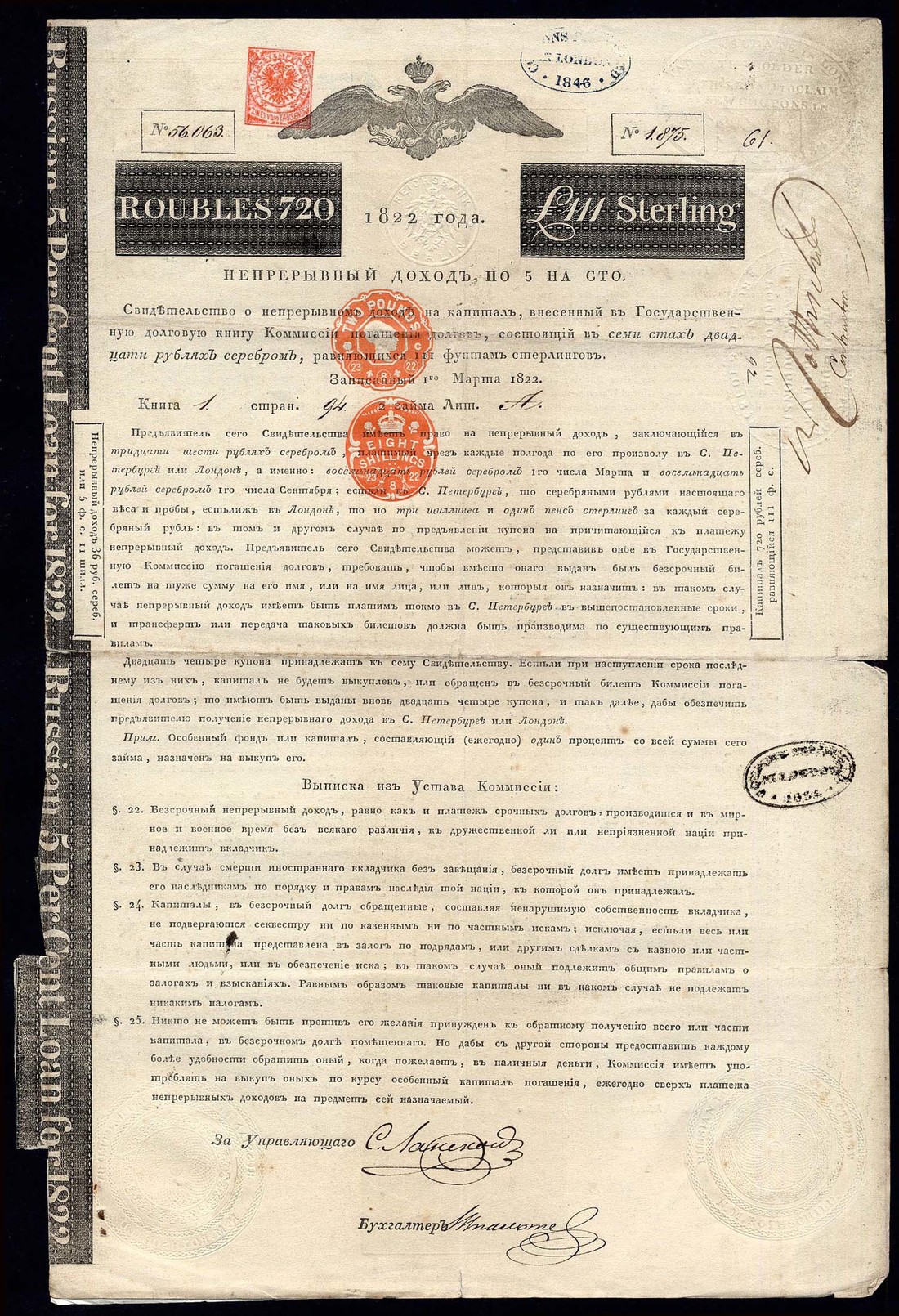 1822, 5% 'Rothschild' loan, bond for 720 roubles or £111, handsigned by Nathan Meyer Rothschild as Contractor, double headed eagle at top, black, on poor quality paper, with talon, a few folds but very fine for issue.