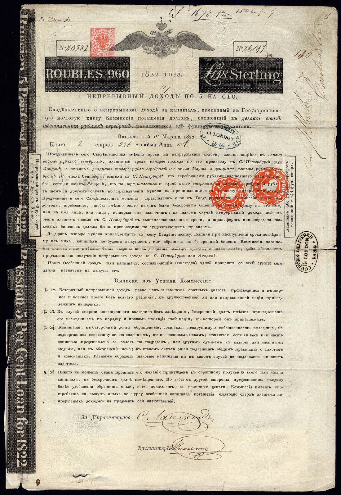 1822, 5% 'Rothschild' loan, bond for 960 roubles or £148, handsigned by Nathan Meyer Rothschild as Contractor, double headed eagle at top, black, on poor quality paper, with talon, a few folds but about very fine for issue.