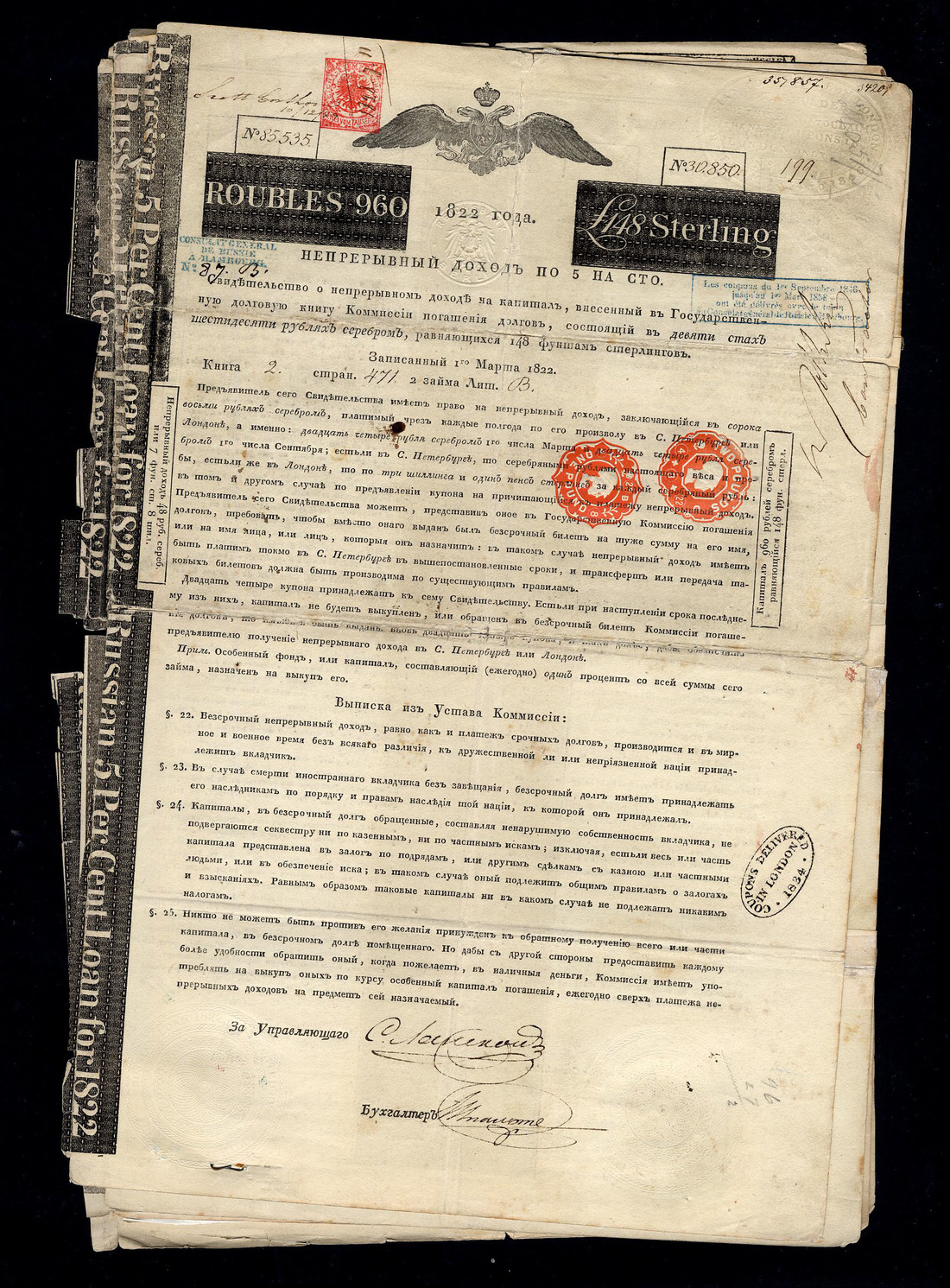 1822, 5% 'Rothschild' loan, a group of bonds for 960 roubles or £148 (6), handsigned by Nathan Meyer Rothschild as Contractor, double headed eagle at top, black, on poor quality paper, with talons, mostly split along folds a couple completely separated, some tape repairs, poor to fair. (6)