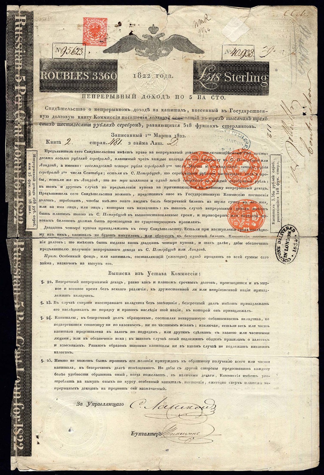1822, 5% 'Rothschild' loan, bond for 3360 roubles or £518, handsigned by Nathan Meyer Rothschild as Contractor, double headed eagle at top, black, on poor quality paper, with talon, split at folds, two tears at top edge, fine and a scarce denomination