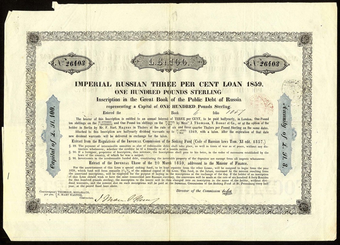 Imperial Russian 3% Loan of 1859, a group of 9 bonds for £100, Russian eagle at top, black and blue, English on reverse, 2 with coupons, 7 without, plus one sheet of coupons for another bond number, generally very fine. (9)
