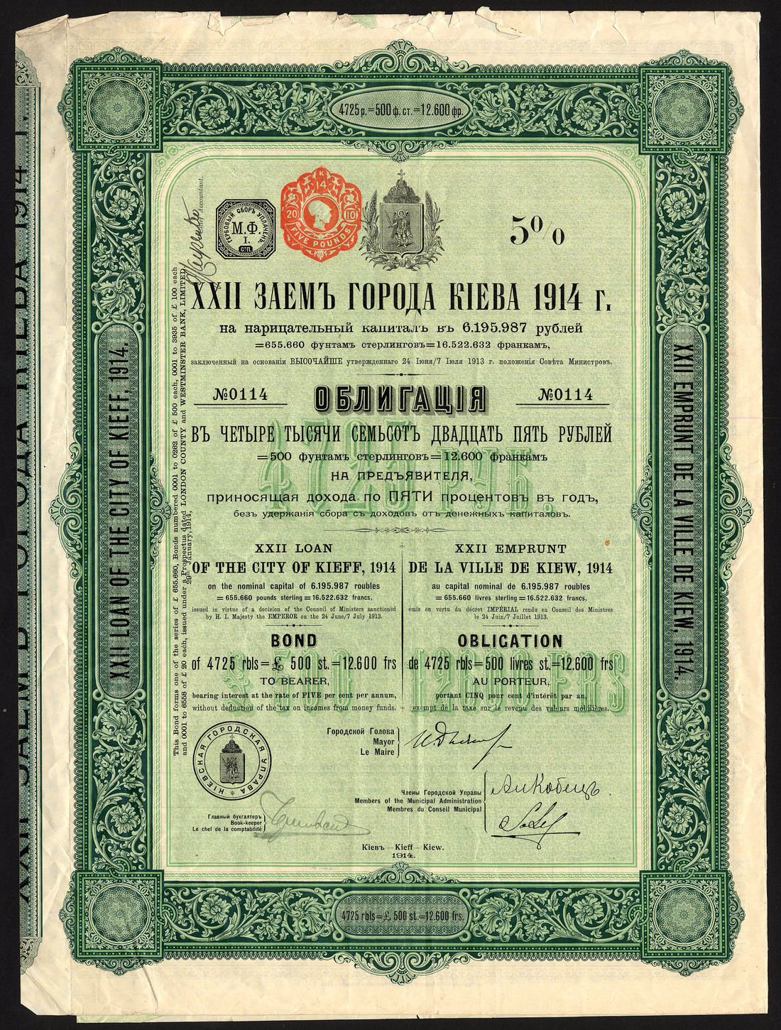 City of Kieff, 1914 5% XXII Loan, bond for £500, no.0114, ornate border, coat of arms at top, green and black, with coupons, ragged top edge with paper loss at the extreme edge, otherwise the body is very fine. rare, only 262 issued.