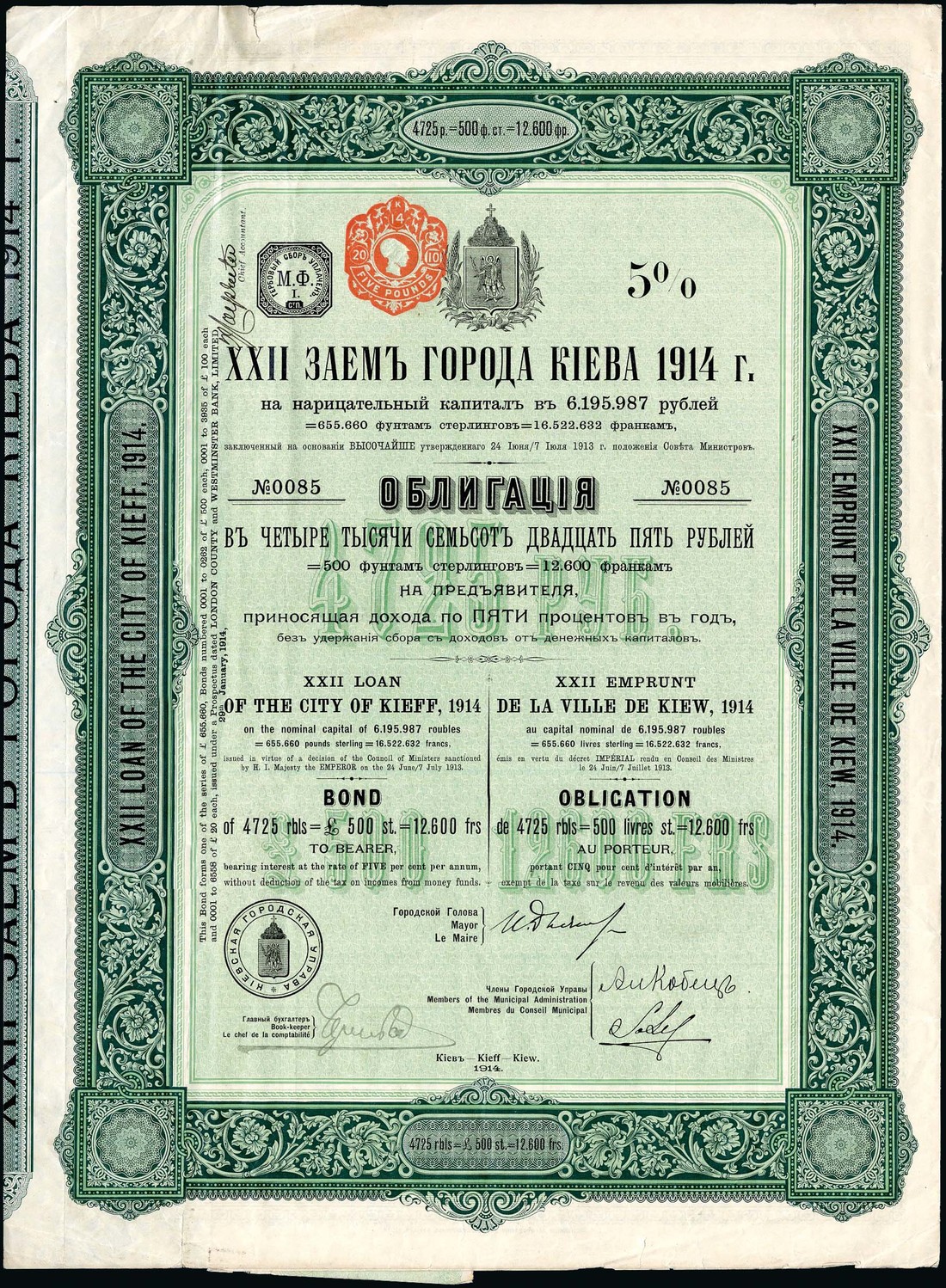 City of Kieff, XXII 5% Loan, 1914, bond for £500, no.0085, ornate border, City arms at top, green and black, with coupons, small tears at top and bottom edge otherwise very fine and scarce, only 262 issued.