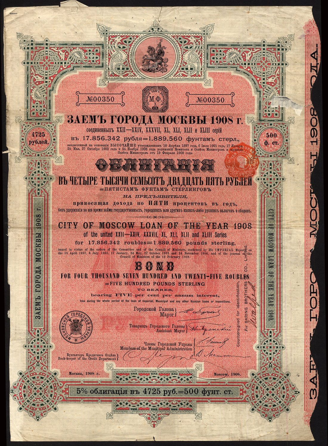 City of Moscow, 1908, 5% Loan, bond for £500, no.350, ornate border, green, pink and black, with coupons, surface damage in top right border, some repaired tears but no paper loss, fine and rare. Only 400 issued.