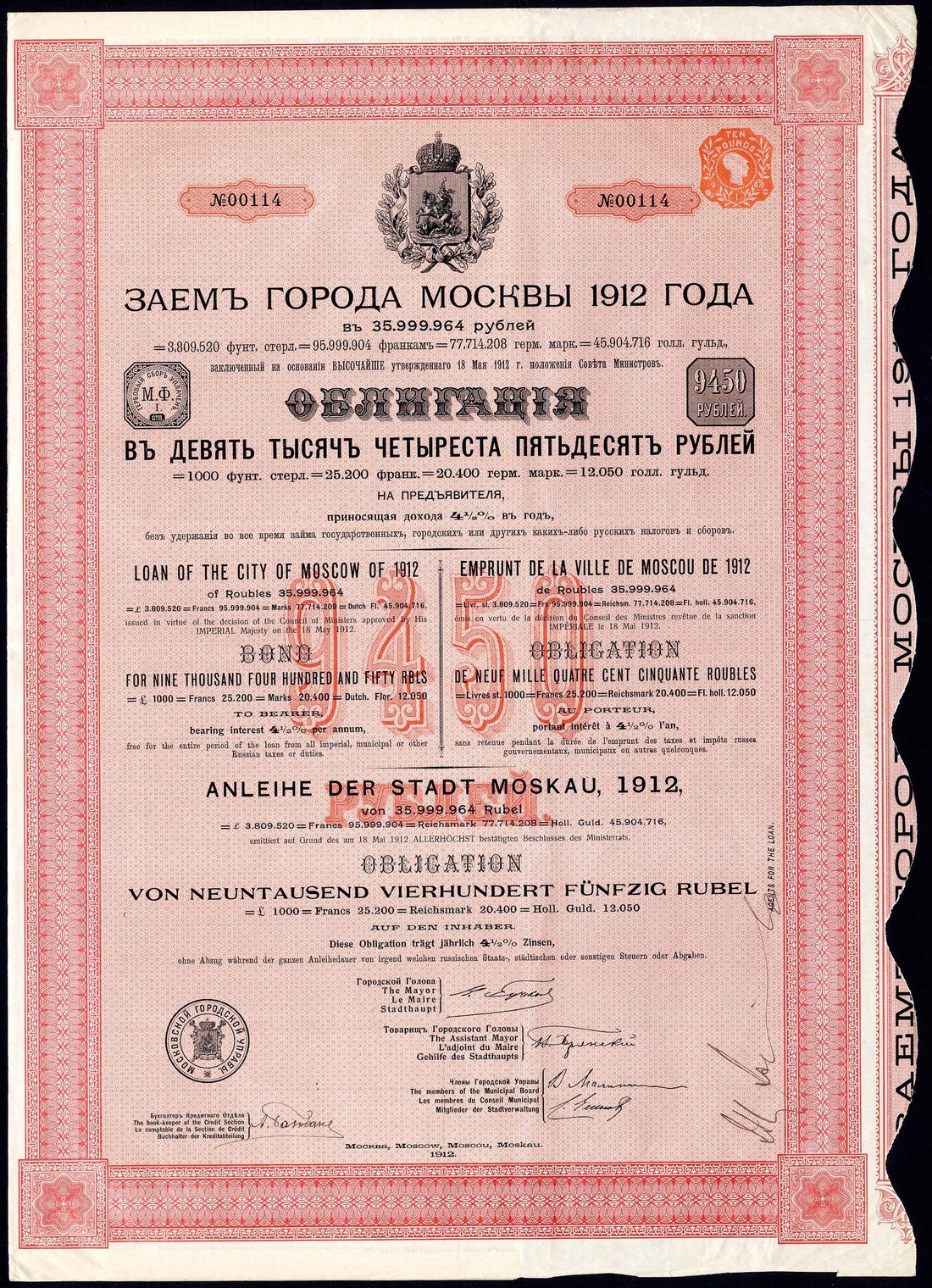 City of Moscow, 1912 4½% Loan, bond for £1000, no.114, large format, coat of arms at top, red and black, text in Russian, English and French, with coupons, very fine to extremely fine.
