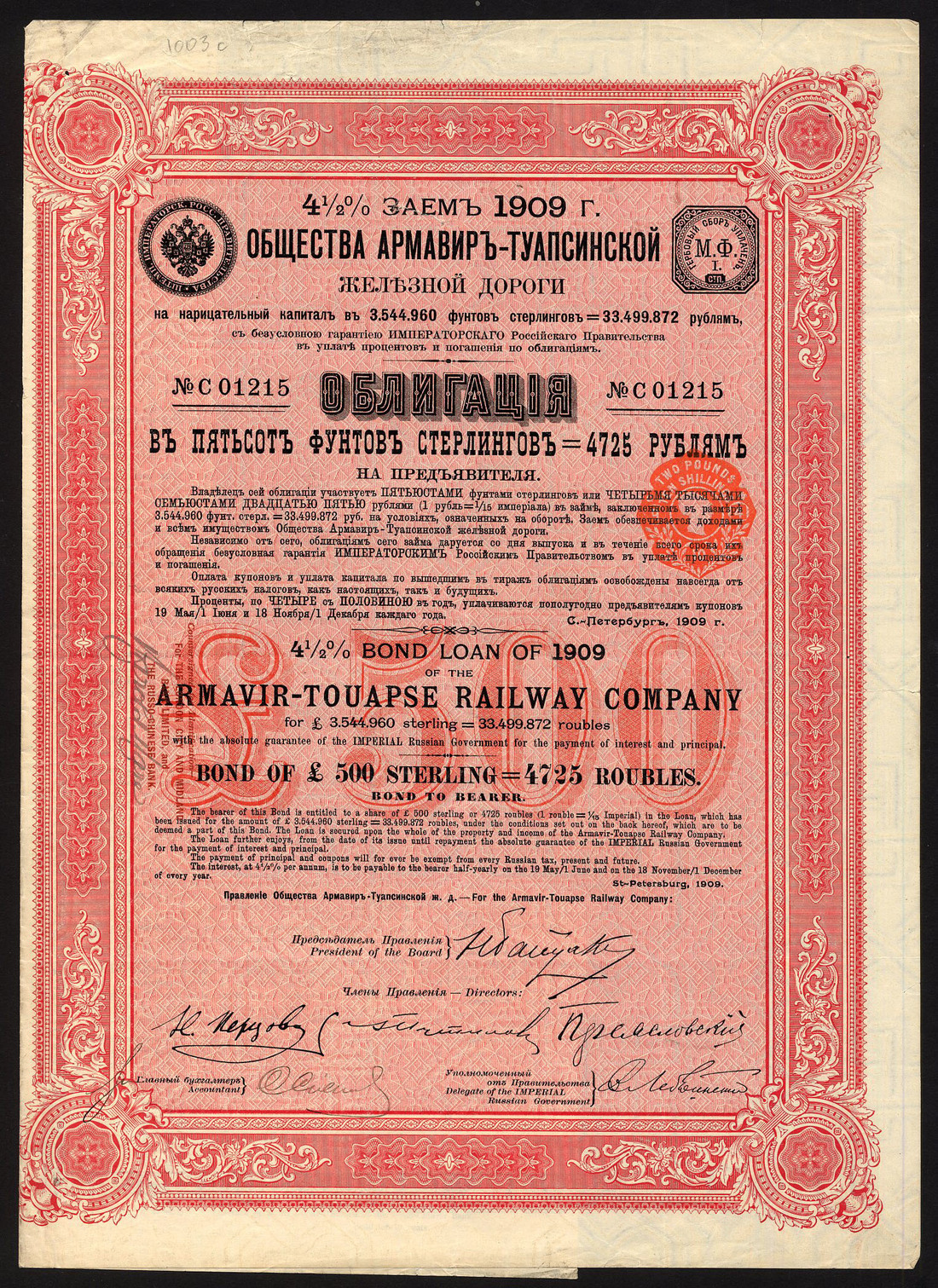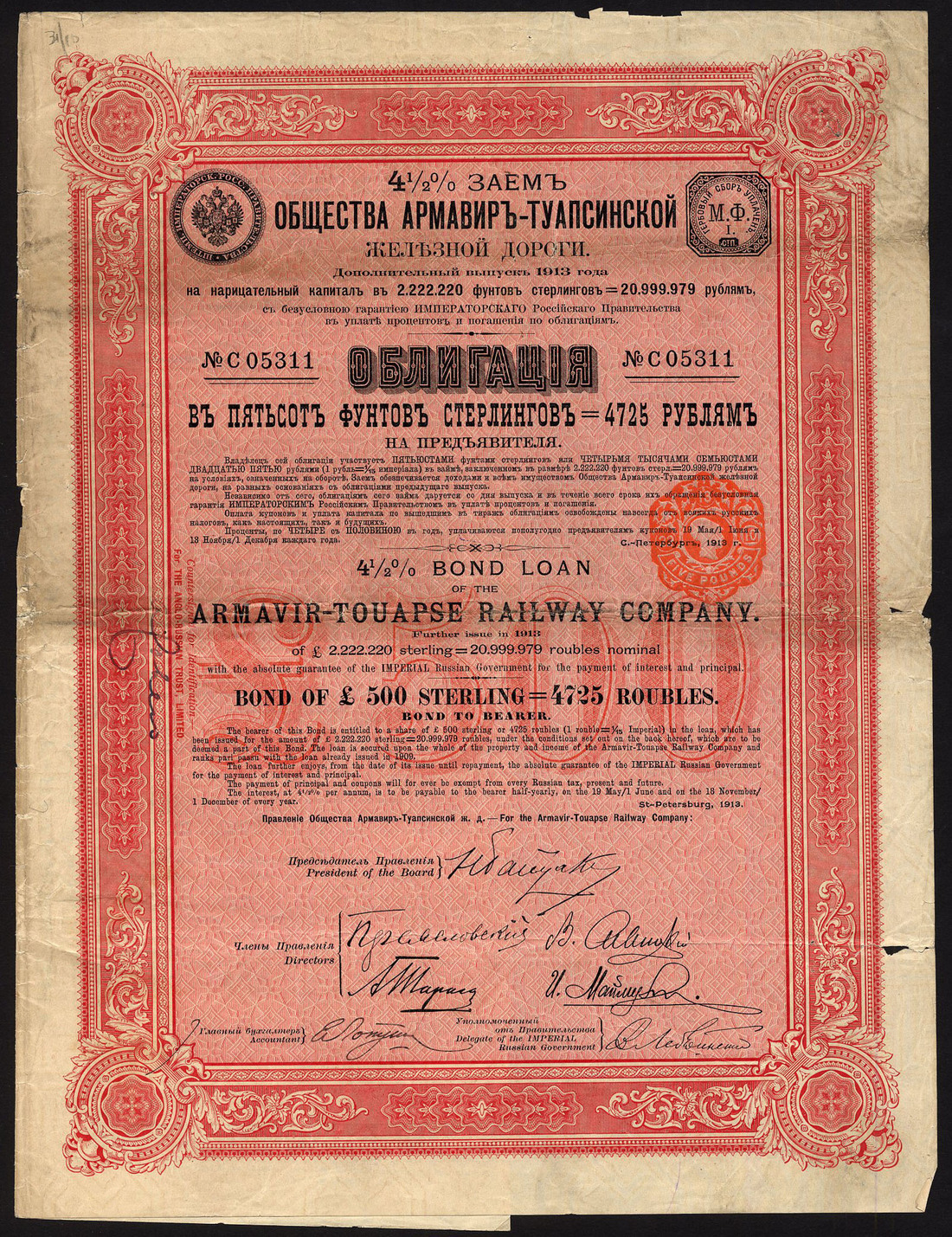 A group of high denomination Russian Railway bonds comprising Armavir Touapse Railway, 1909, £500; 1913, £500; Russian South Eastern Railway Co., 1914, £500 and Troitzk Railway, 1913, £500, all red and black, with coupons, all with edge tears but no paper loss, fine and better. (4)